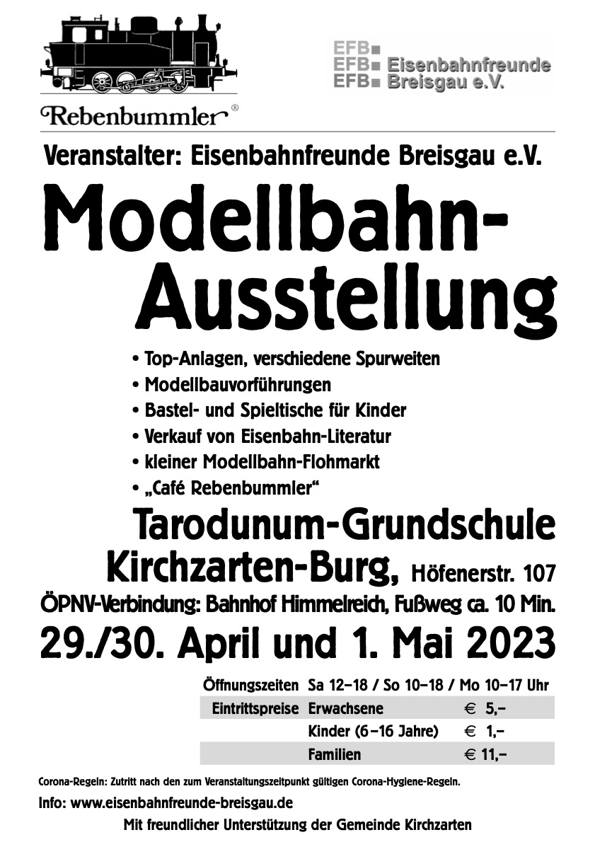 Am Wochenende des 29. April - 1. Mai 2023 durften wir unsere Nebenbahn-Anlage in Kirchzarten-Burg bei der Modellbahnausstellung der Eisenbahnfreunde Breisgau zeigen.