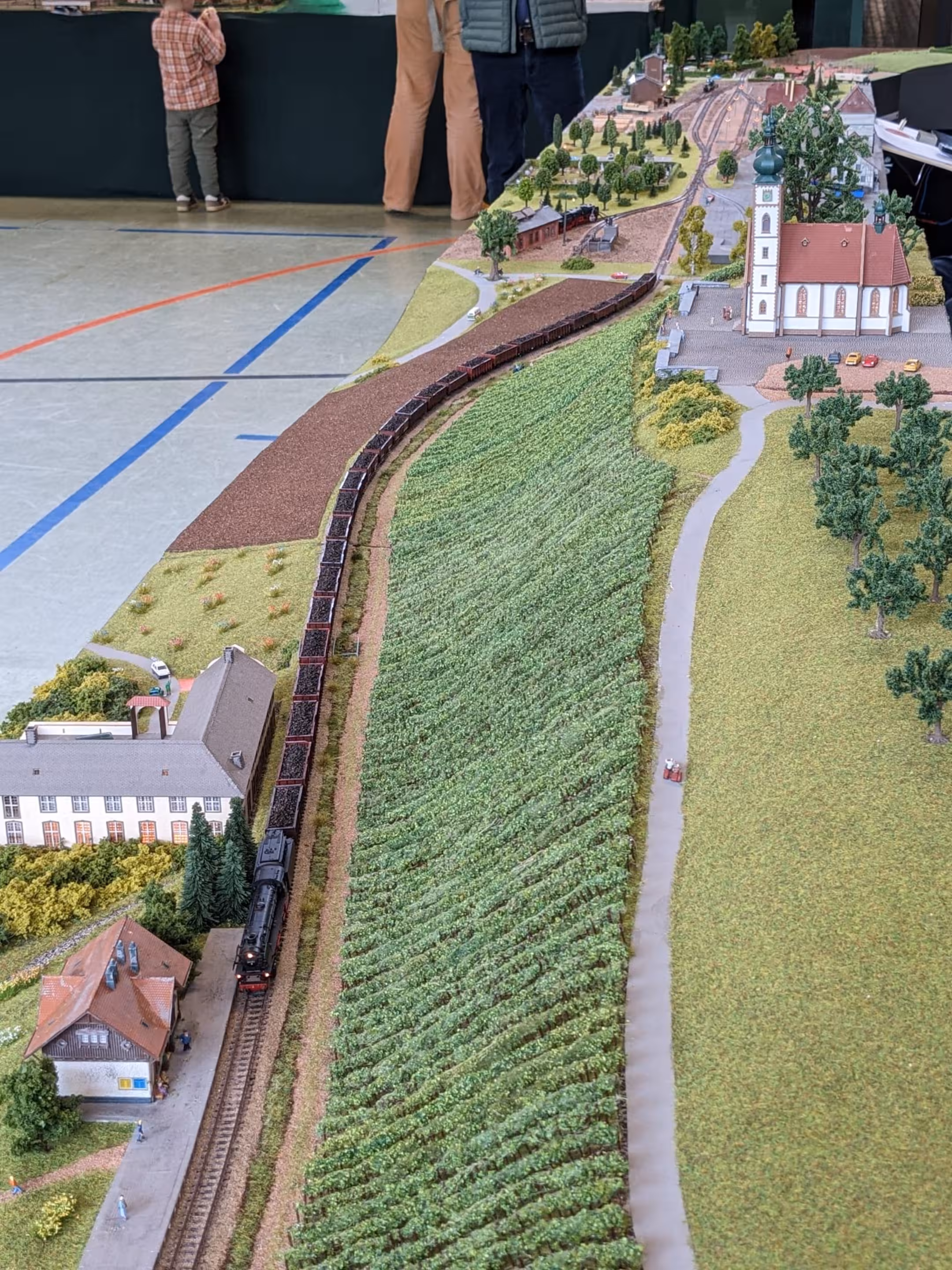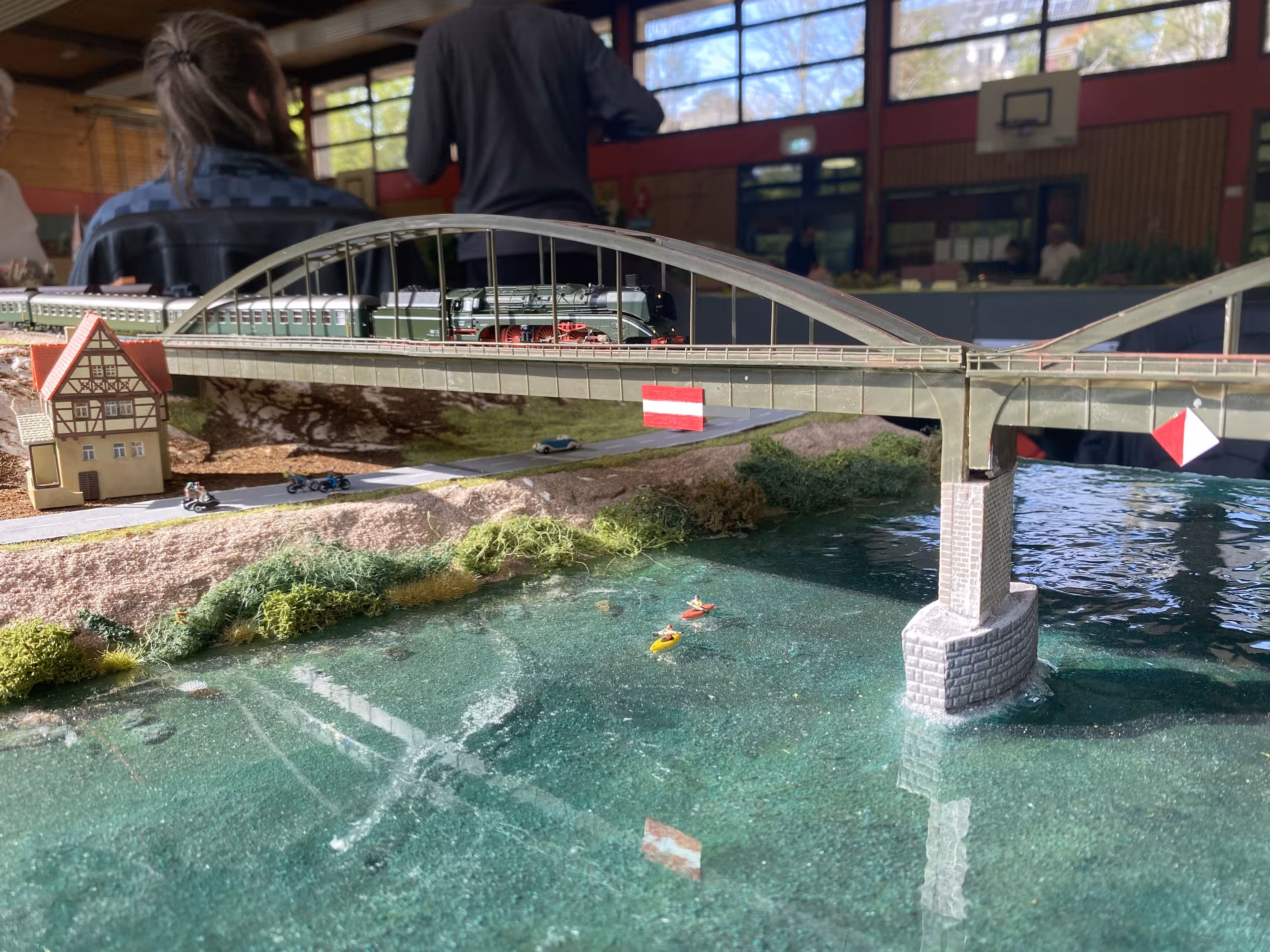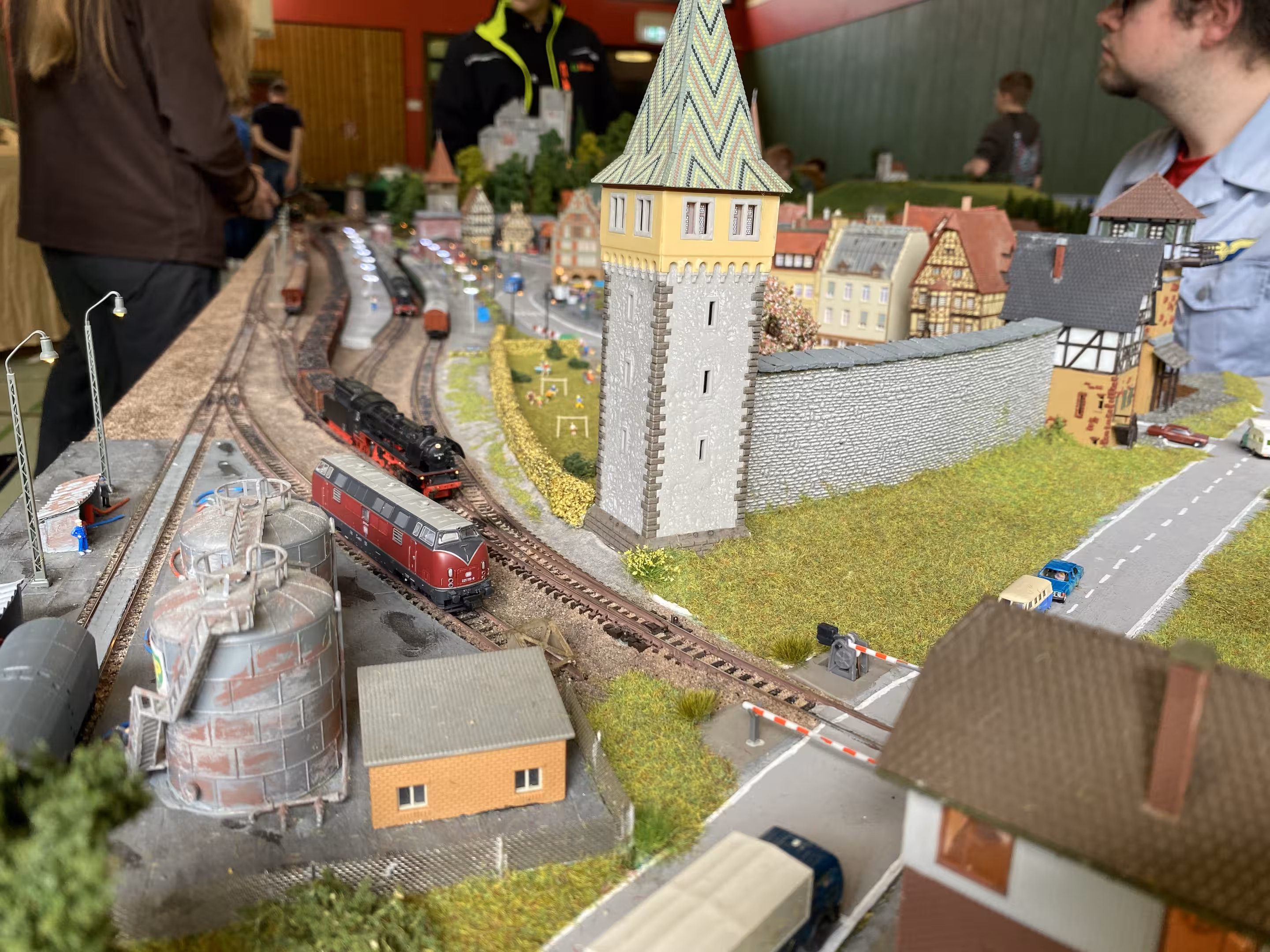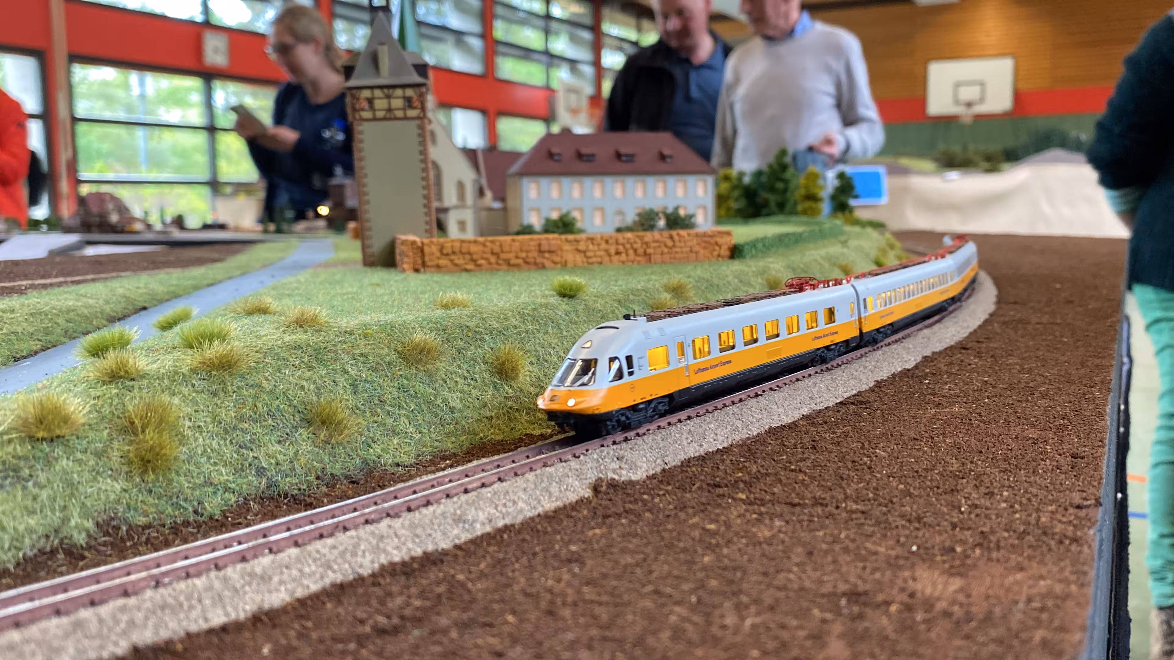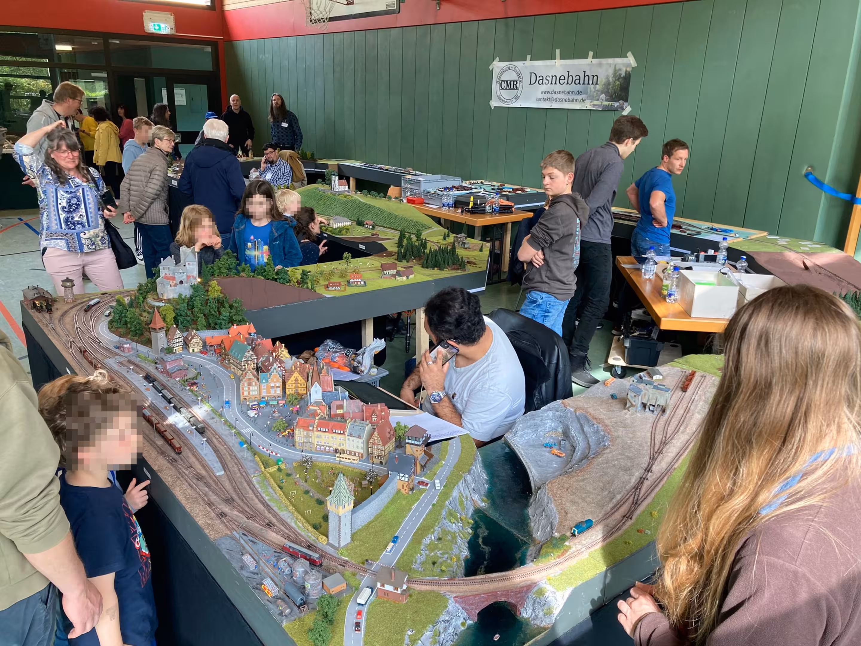 Desweiteren können wir wieder sagen: Unsere Anlage war ein Kindermagnet. Am 3. Ausstellungstag (1. Mai) war das Wetter trüber und es hat mehr geregnet – und so hat es auch mehr Familien in die Ausstellungshalle gelockt. Nicht nur die niedrige Anlagenhöhe, sondern auch das Miteinbinden in das Spielgeschehen hat zeitweise dafür gesorgt, dass an jeder Ecke Kindernasen über unsere Anlage starrten.