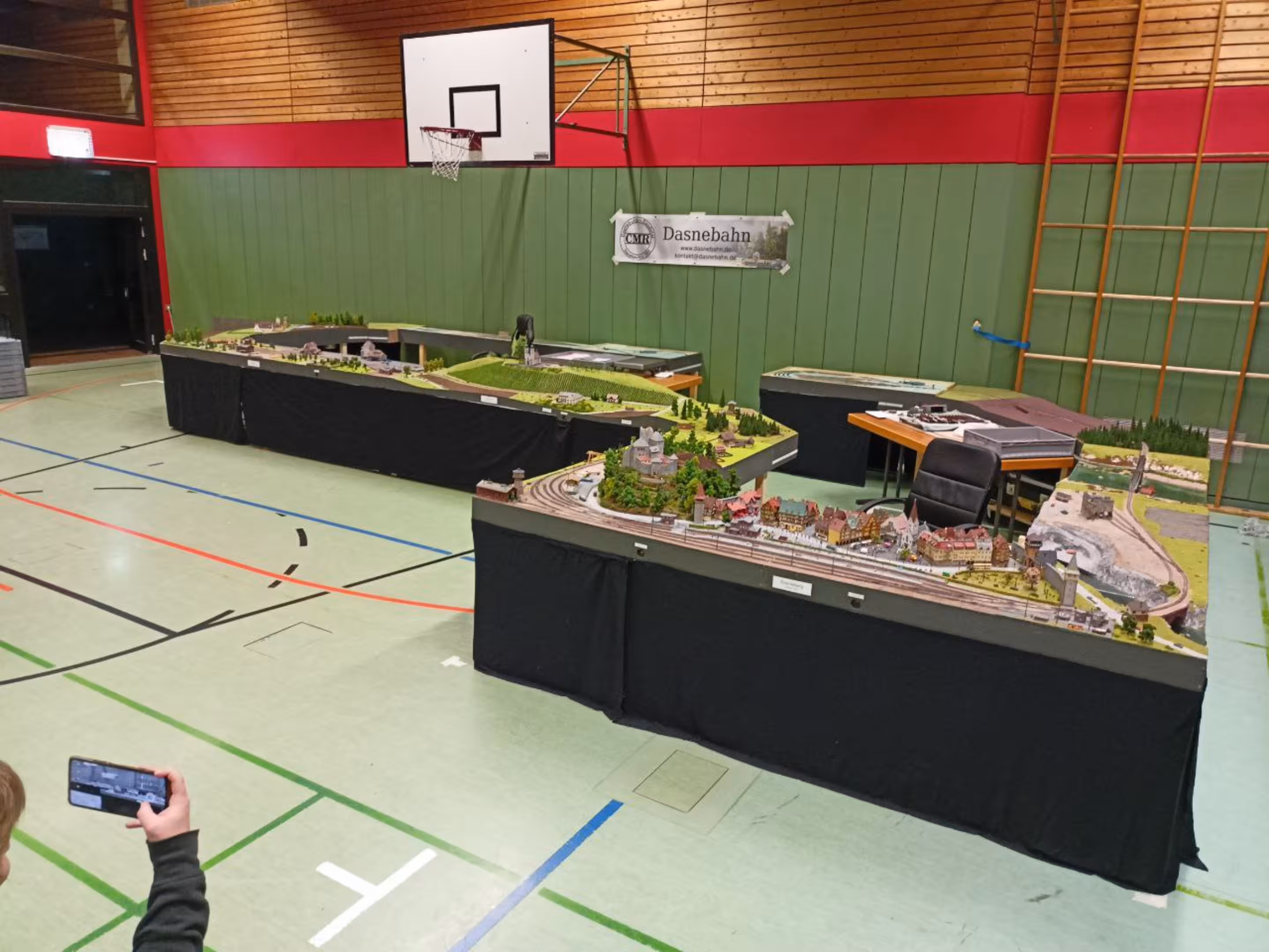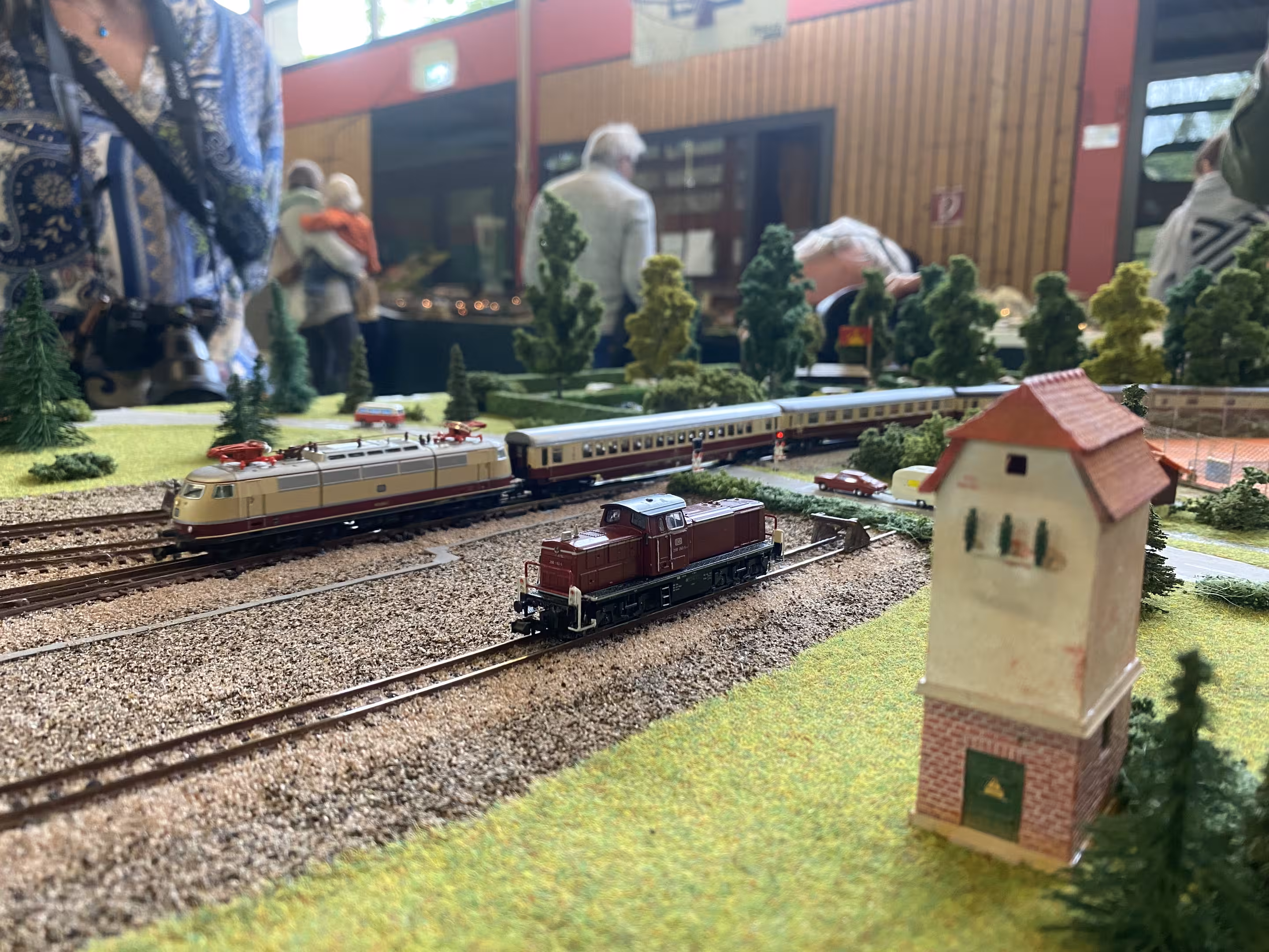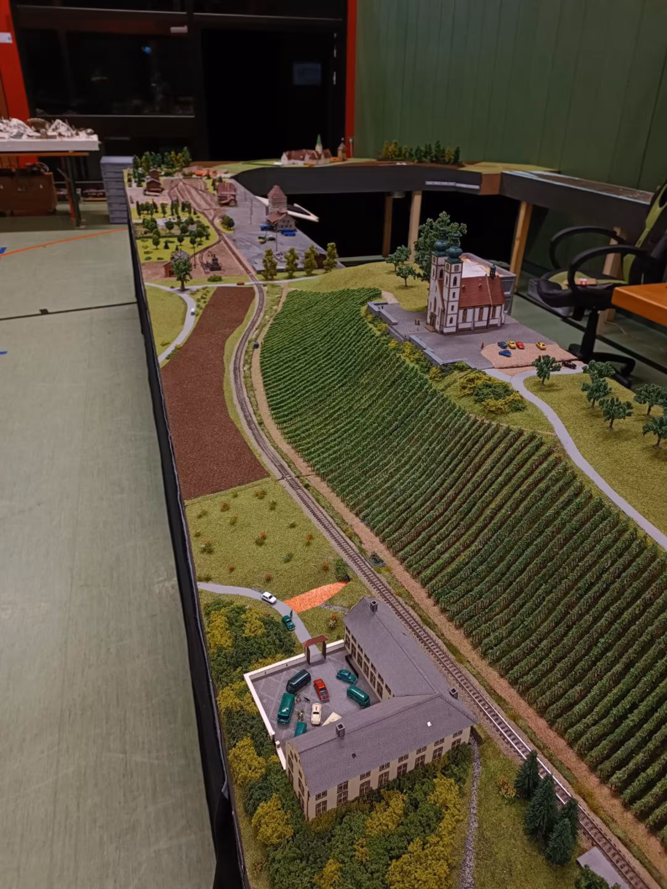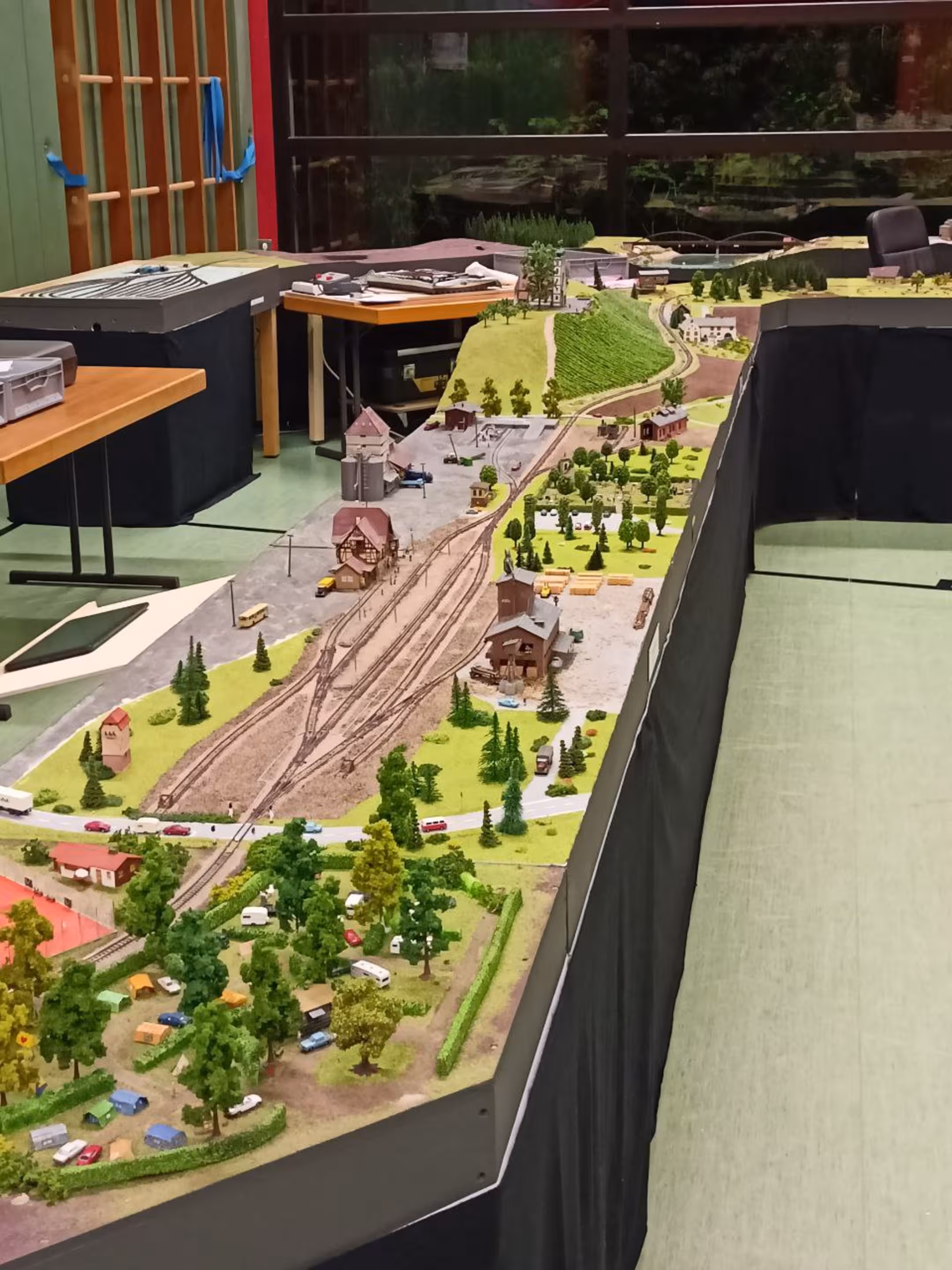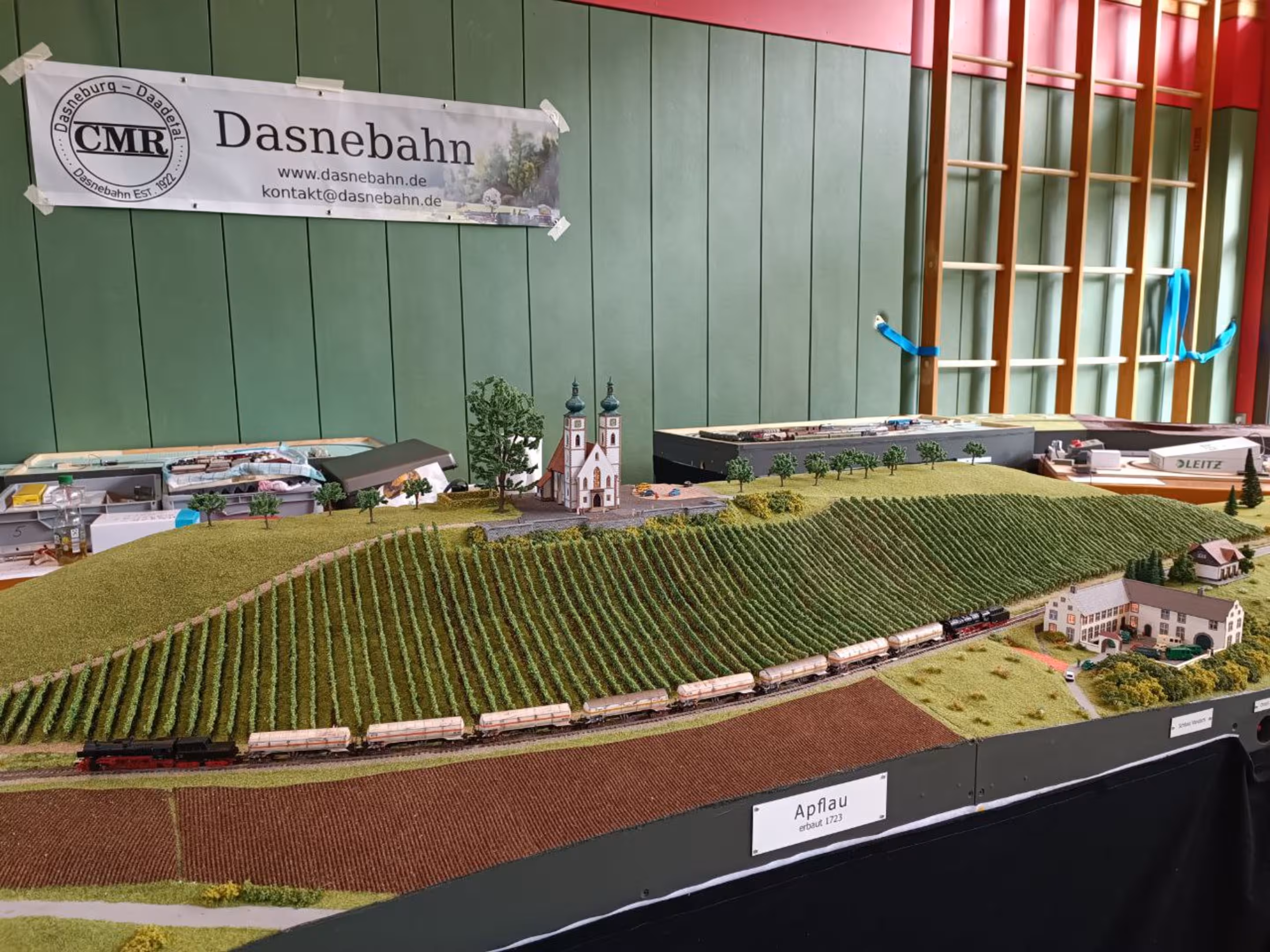 Neben unserer Spur-N-Anlage waren auch eine große H0-Modulanlage und die Schweizer Schmalspur-Anlage "Surava" der EFB sowie eine Märklin-Anlage von Peter Kappus zu sehen. Zudem luden ein Modellbahn-Flohmarkt zum Stöbern, Spielanlagen und Basteltische für Kinder und das Café Rebenbummler zum Verweilen ein.