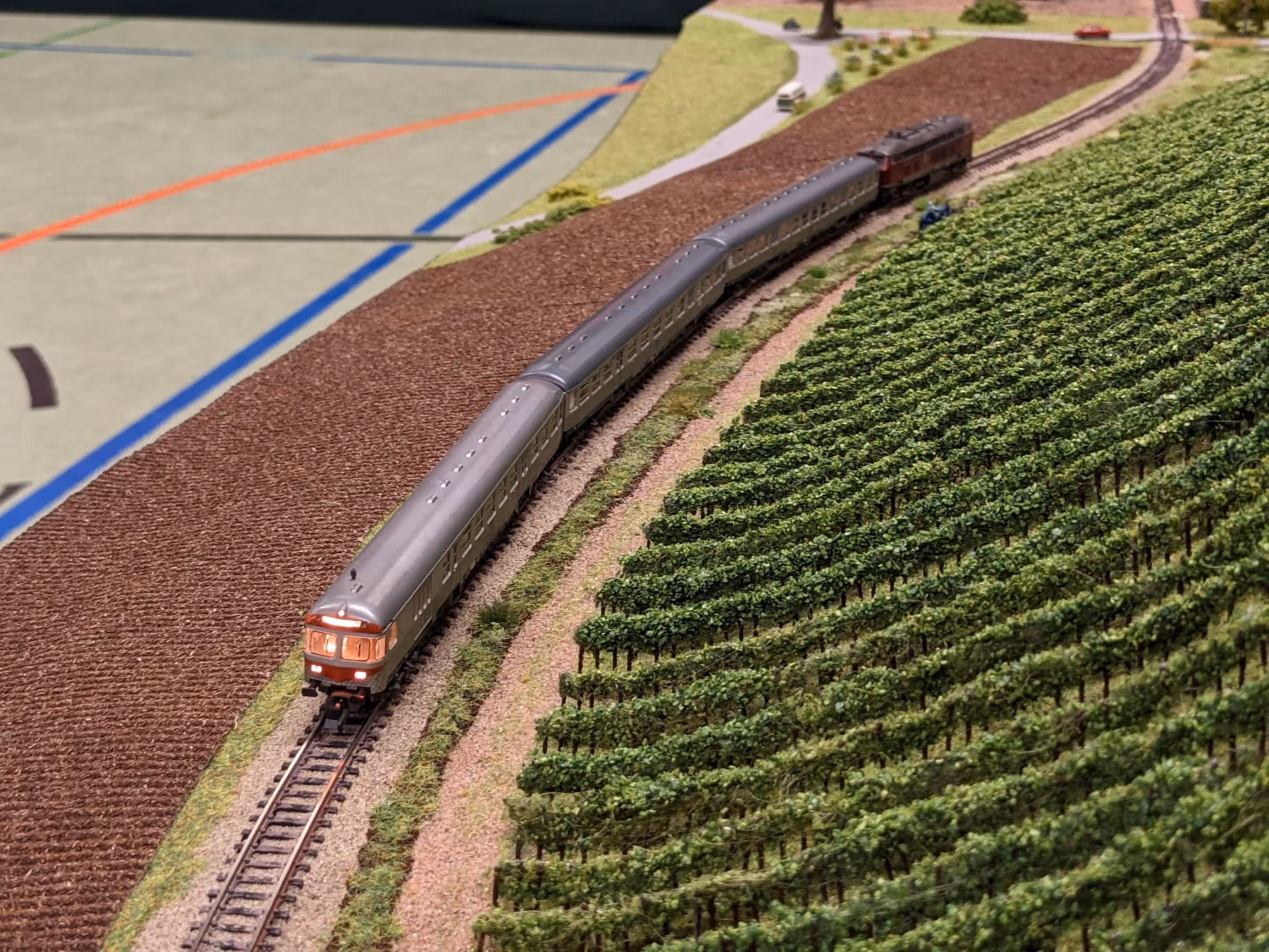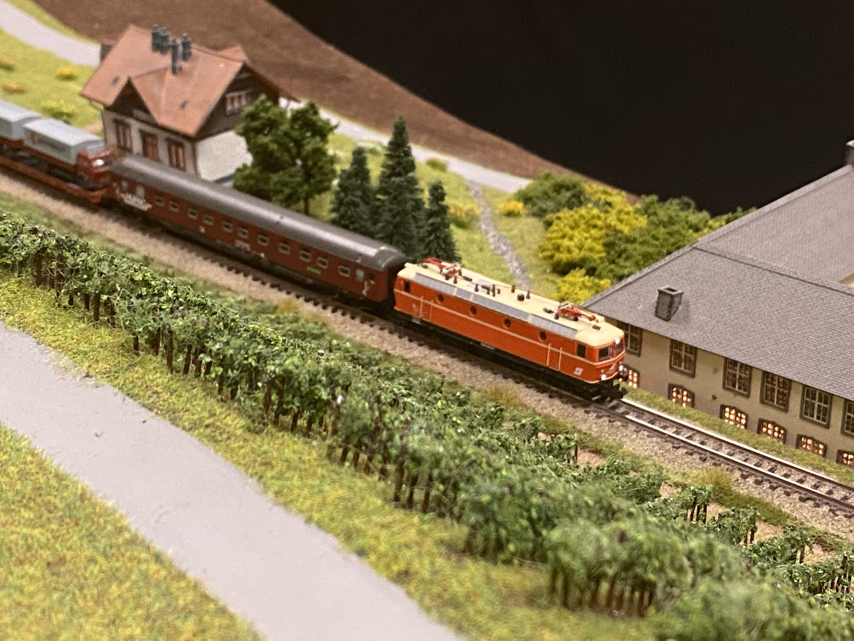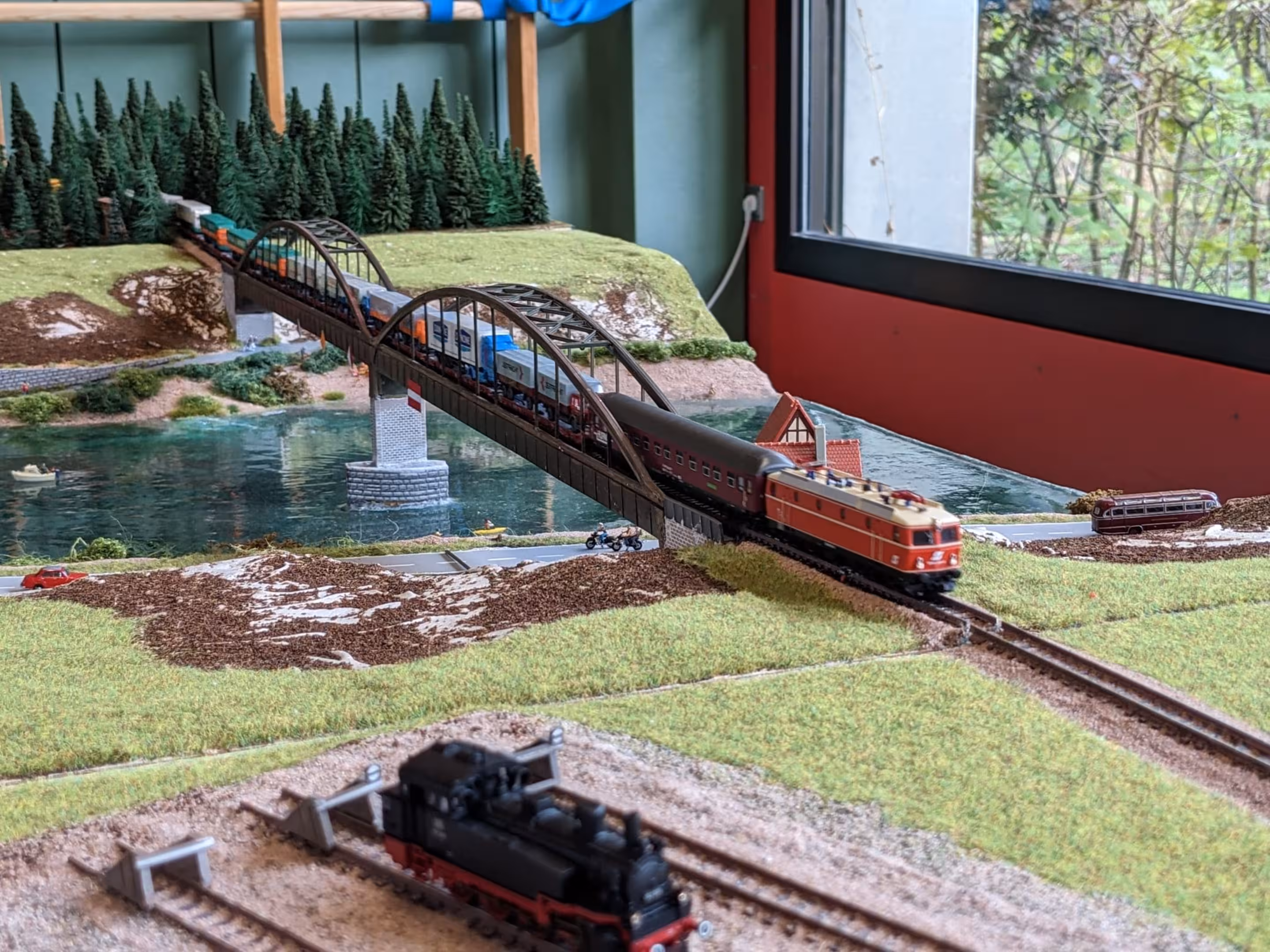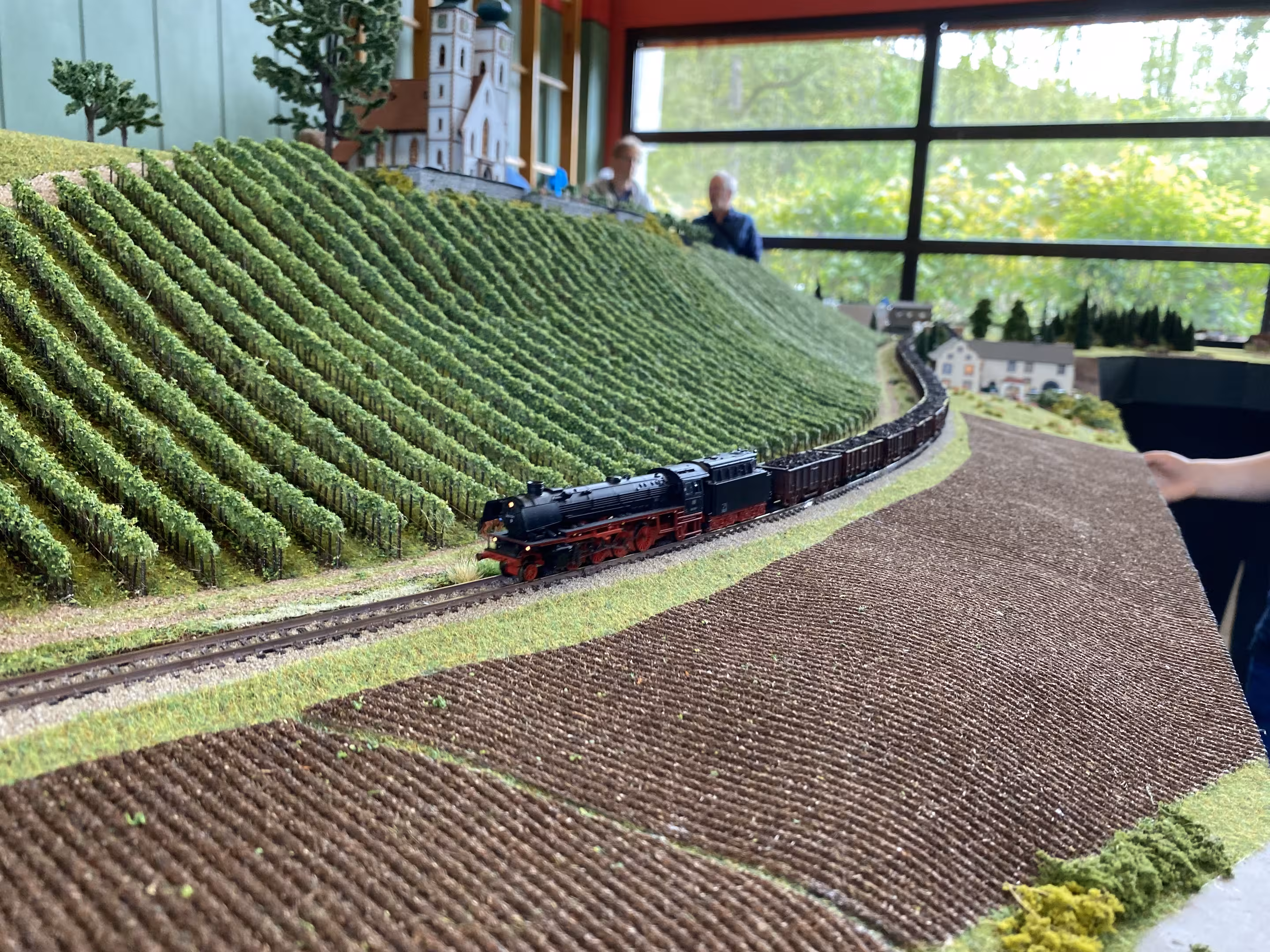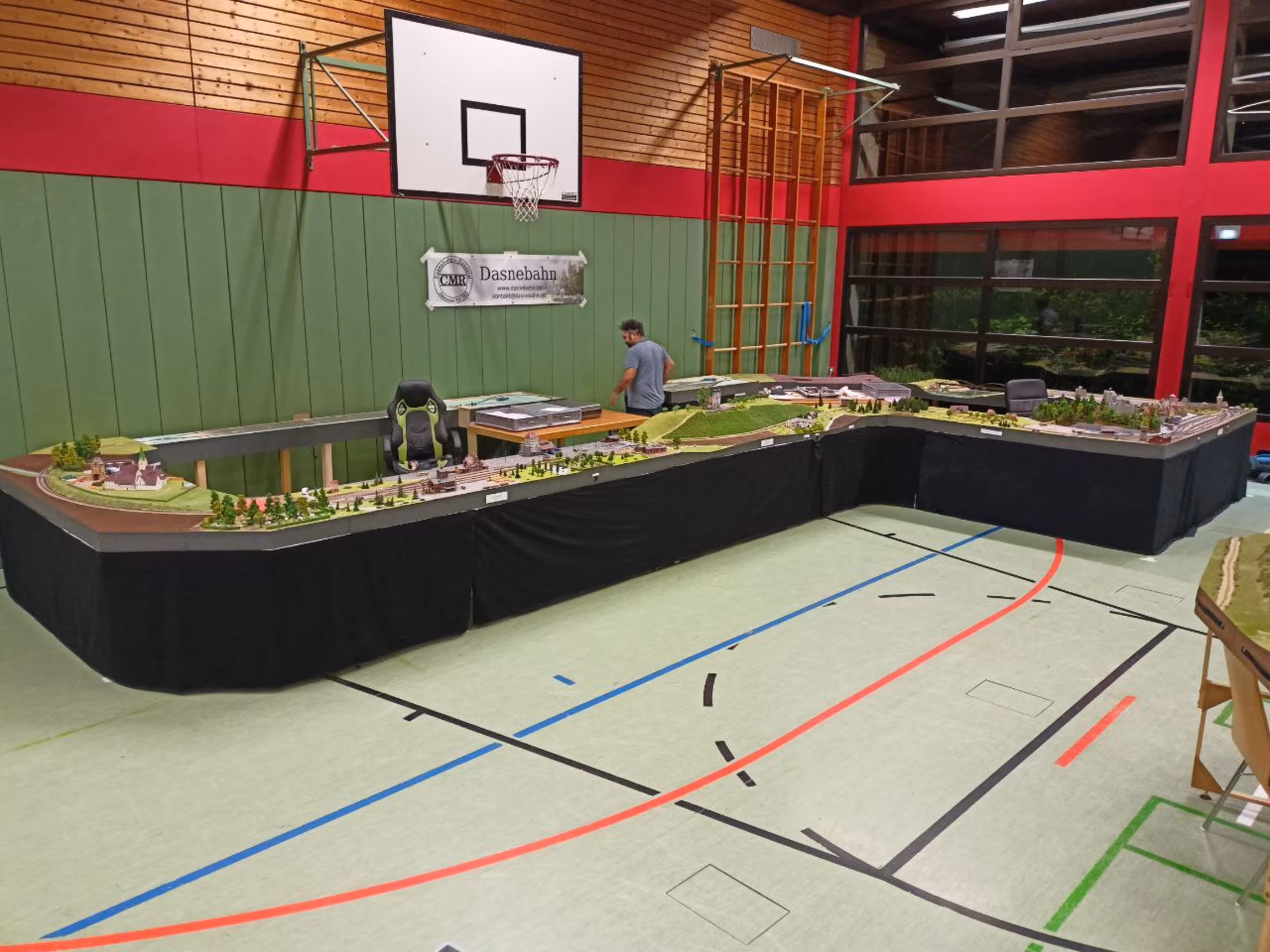 Neben unserer Spur-N-Anlage waren auch eine große H0-Modulanlage und die Schweizer Schmalspur-Anlage "Surava" der EFB sowie eine Märklin-Anlage von Peter Kappus zu sehen. Zudem luden ein Modellbahn-Flohmarkt zum Stöbern, Spielanlagen und Basteltische für Kinder und das Café Rebenbummler zum Verweilen ein.