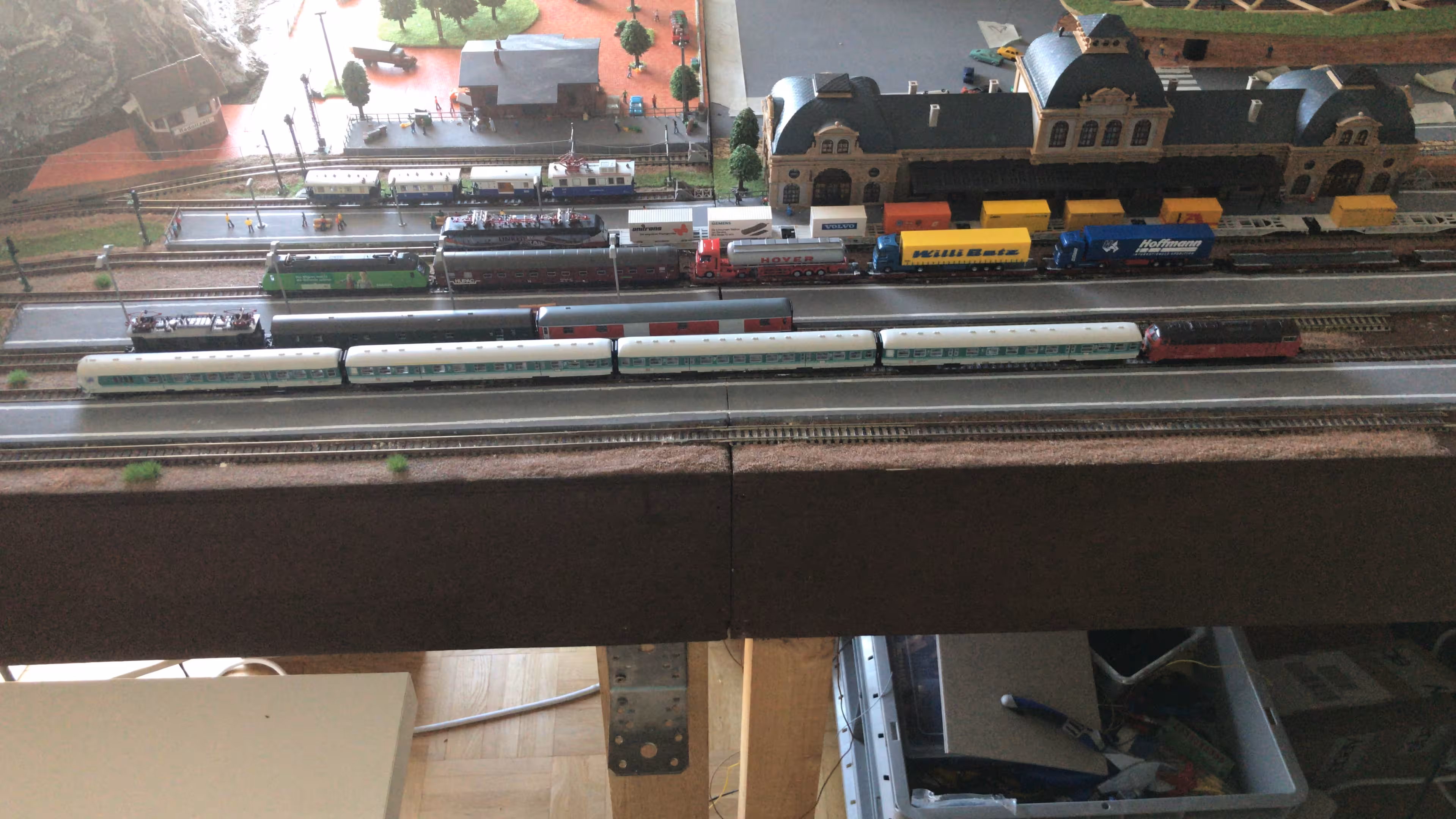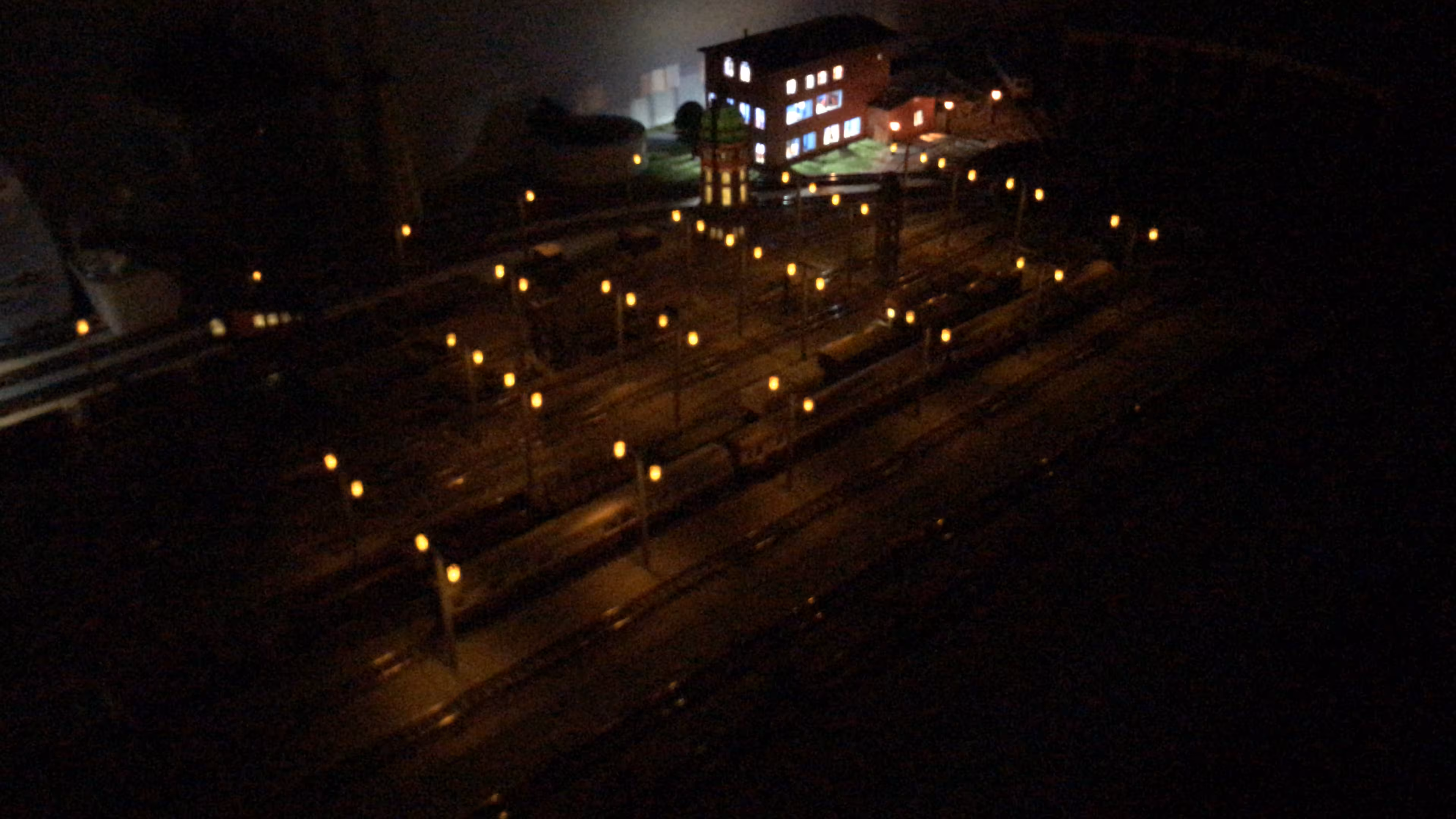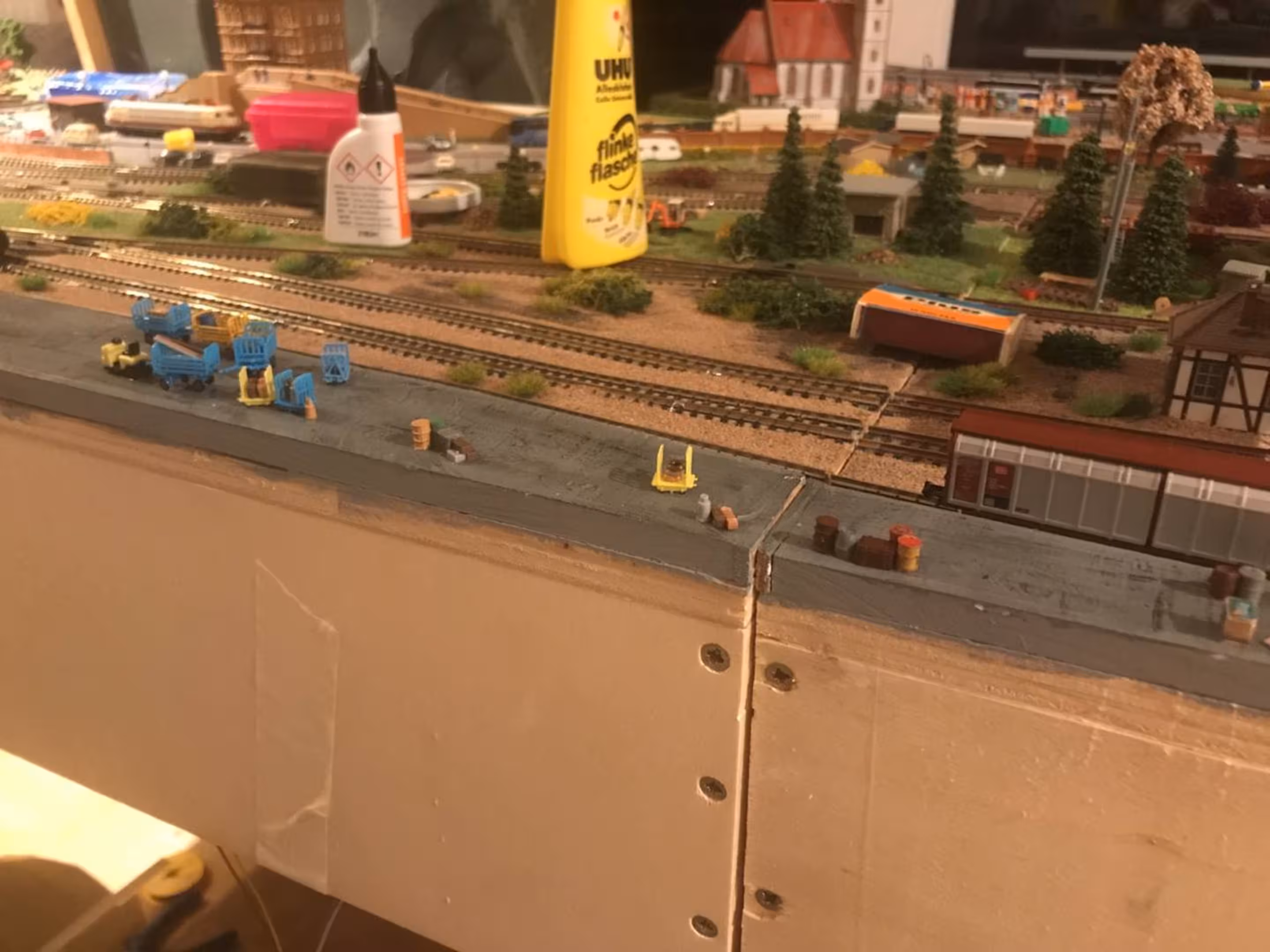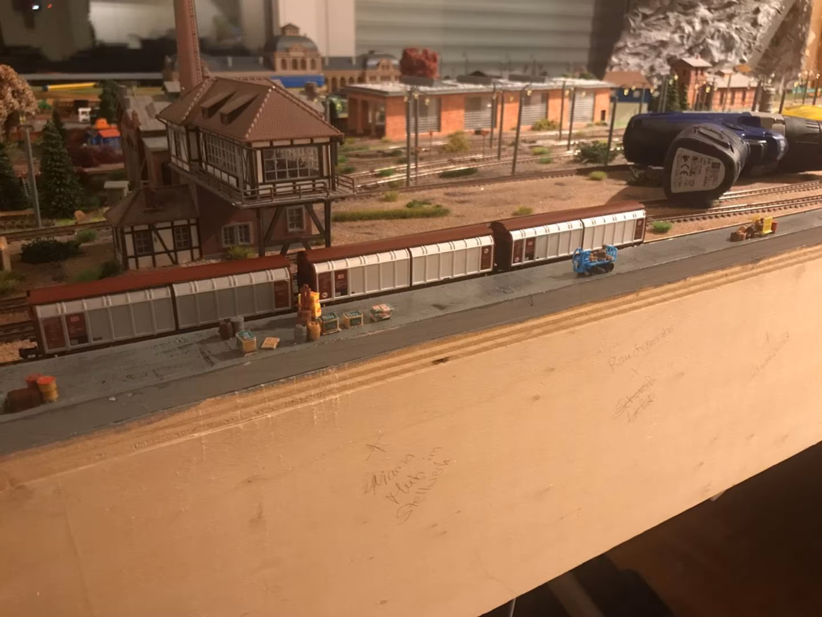 Schon hier begann Chris seine ersten Gehversuche in puncto "Eigenbau". So entstanden diverse Gebäude wie der Busbahnhof (in Anlehnung an den in Lahr), der Ringlokschuppen, Bahnsteigdächer, Postbahnsteig, das Widerlager zur "Wiwilí-Brücke" (entsprechend der in Freiburg), Signaltafeln und vieles mehr. Auch die Leuchten im Bahnbetriebswerk wurden aus Messingrohr und LEDs selbstgelötet!