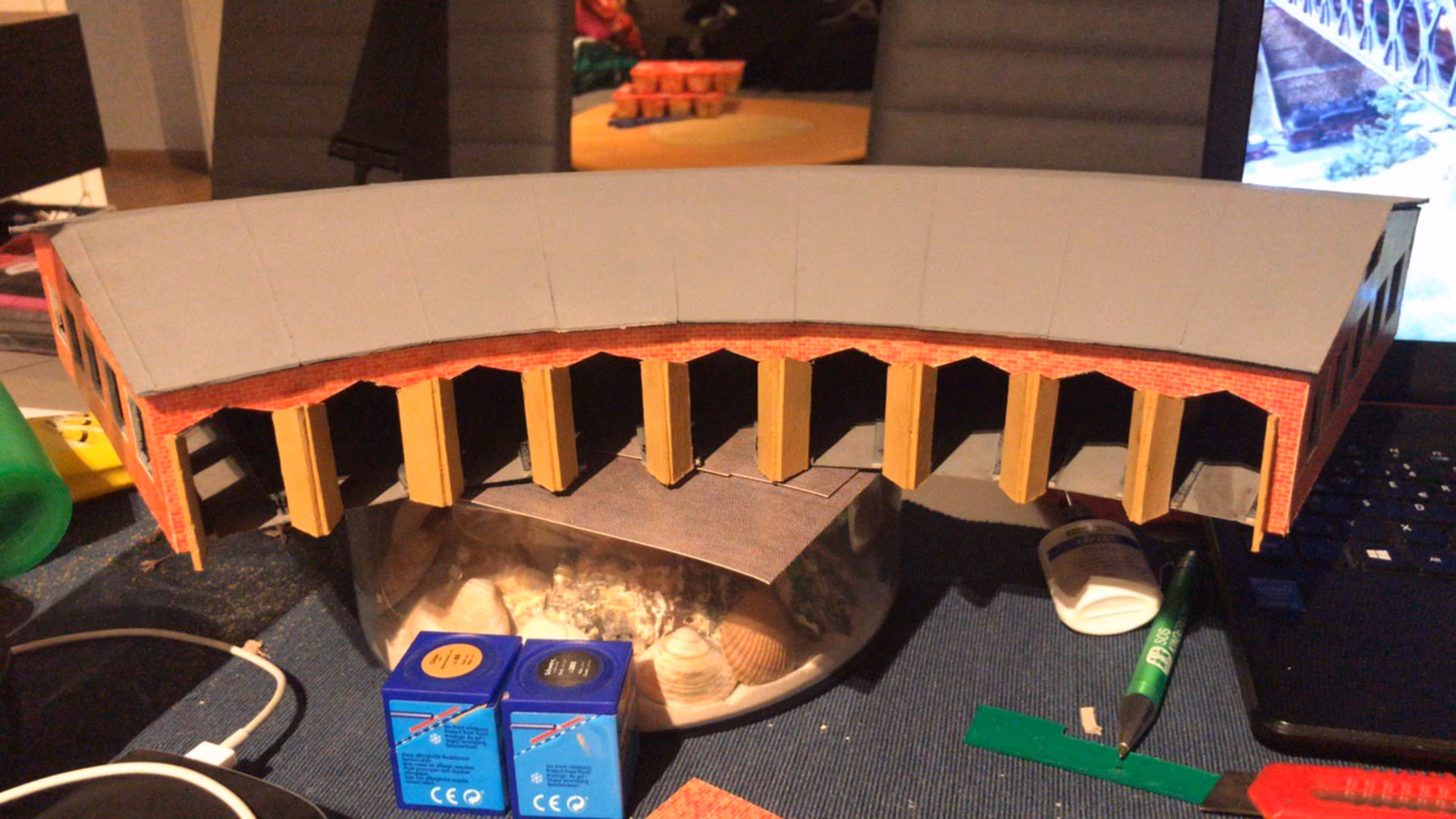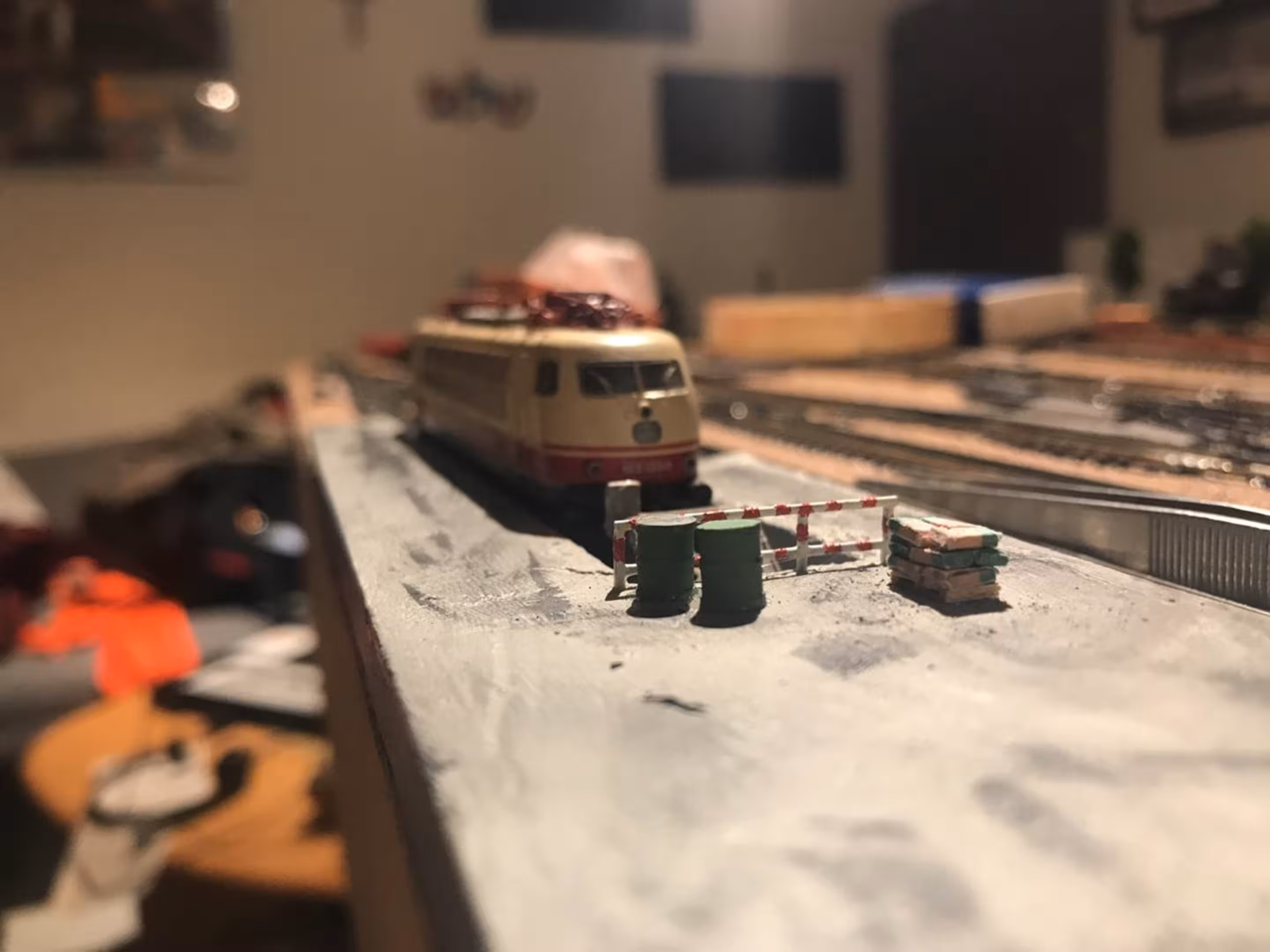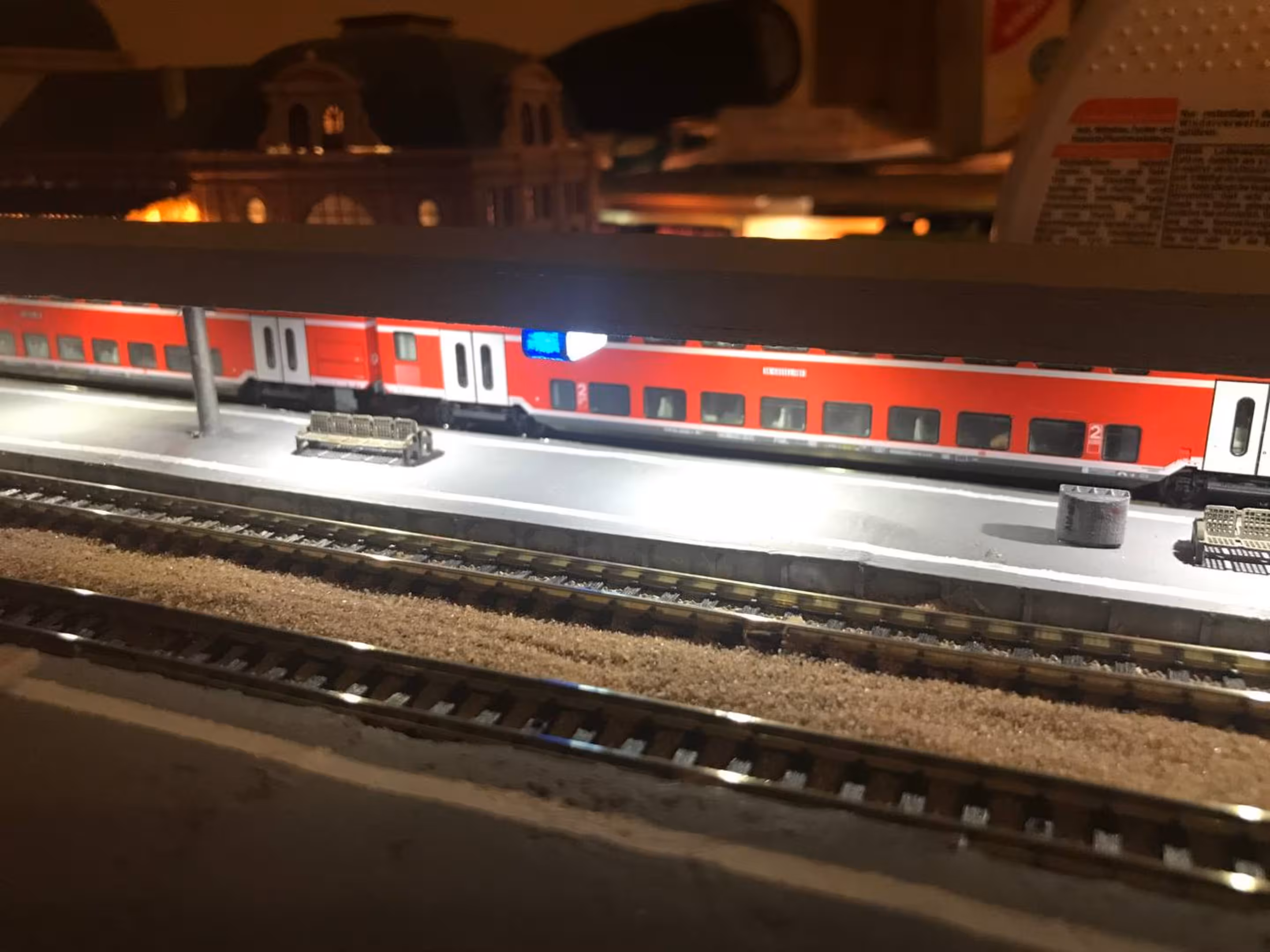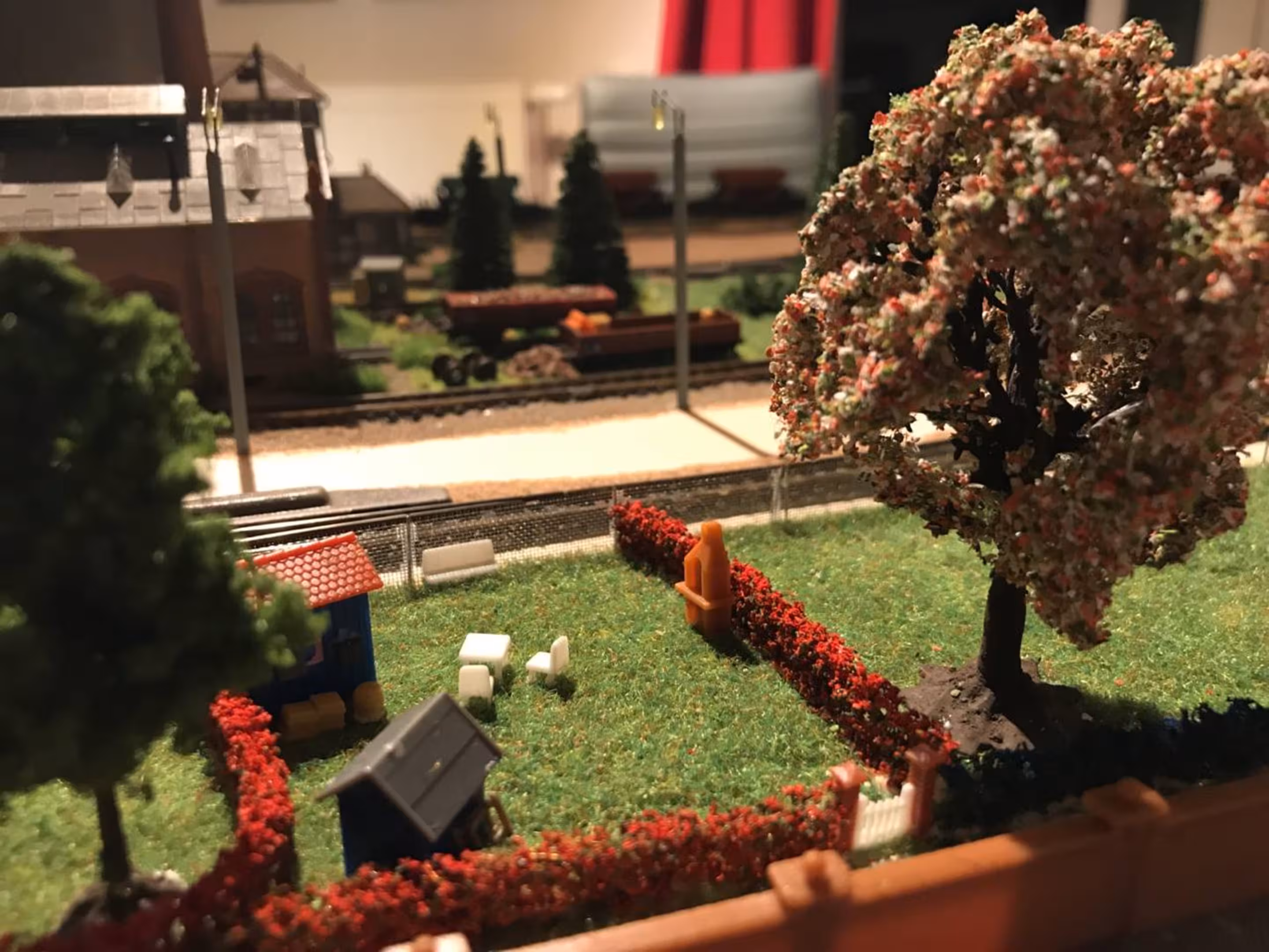 Schon hier begann Chris seine ersten Gehversuche in puncto "Eigenbau". So entstanden diverse Gebäude wie der Busbahnhof (in Anlehnung an den in Lahr), der Ringlokschuppen, Bahnsteigdächer, Postbahnsteig, das Widerlager zur "Wiwilí-Brücke" (entsprechend der in Freiburg), Signaltafeln und vieles mehr. Auch die Leuchten im Bahnbetriebswerk wurden aus Messingrohr und LEDs selbstgelötet!