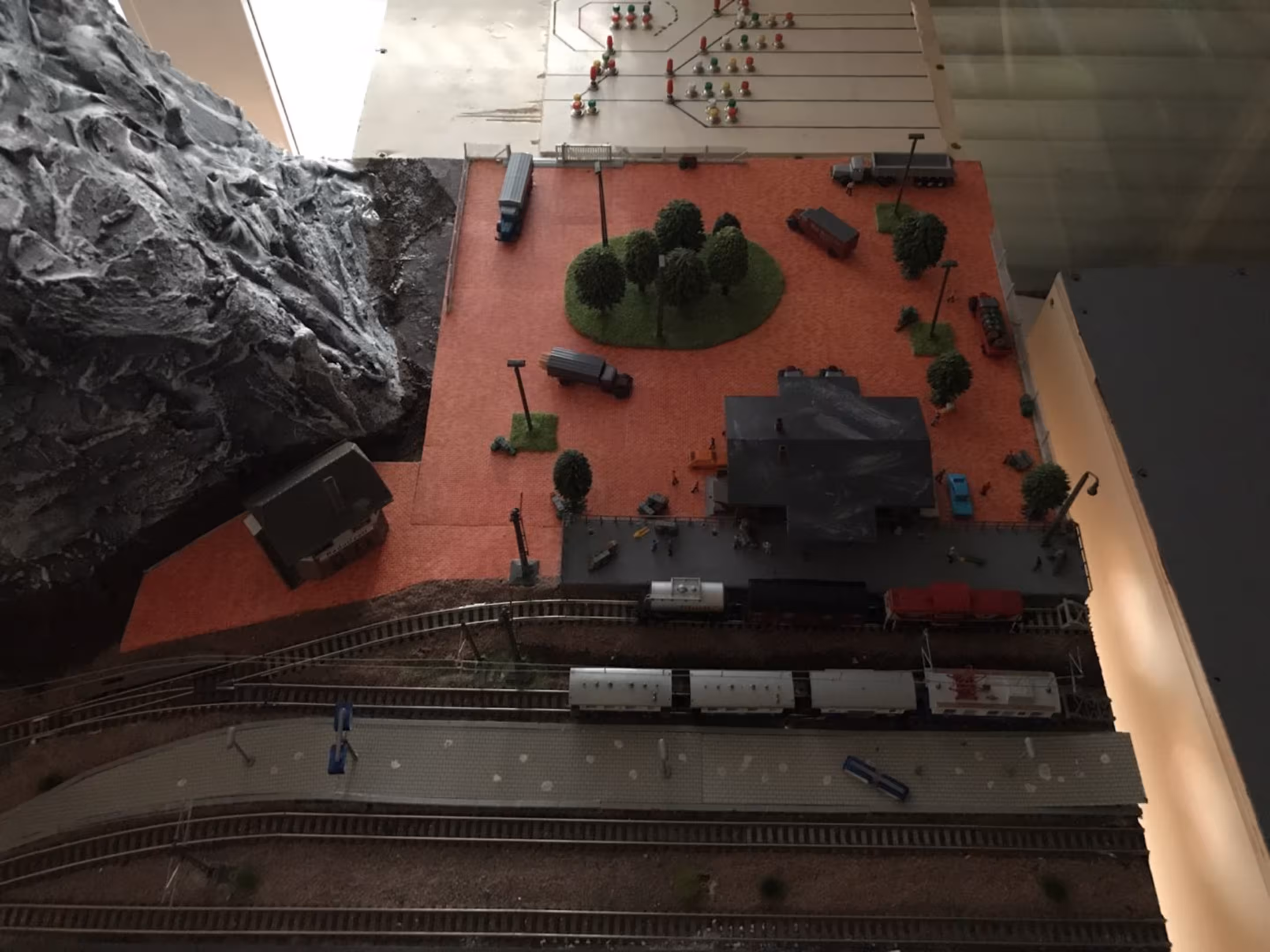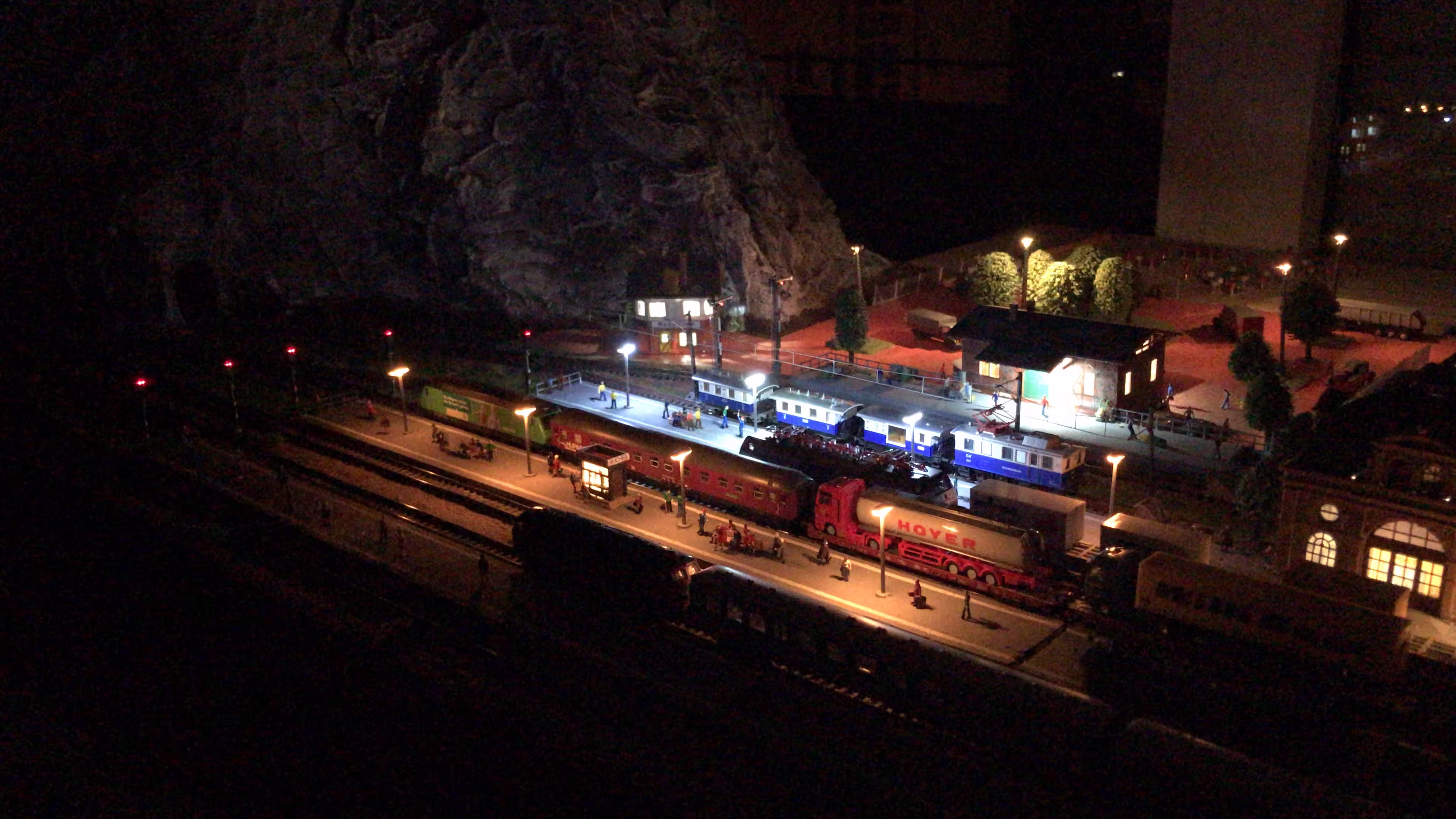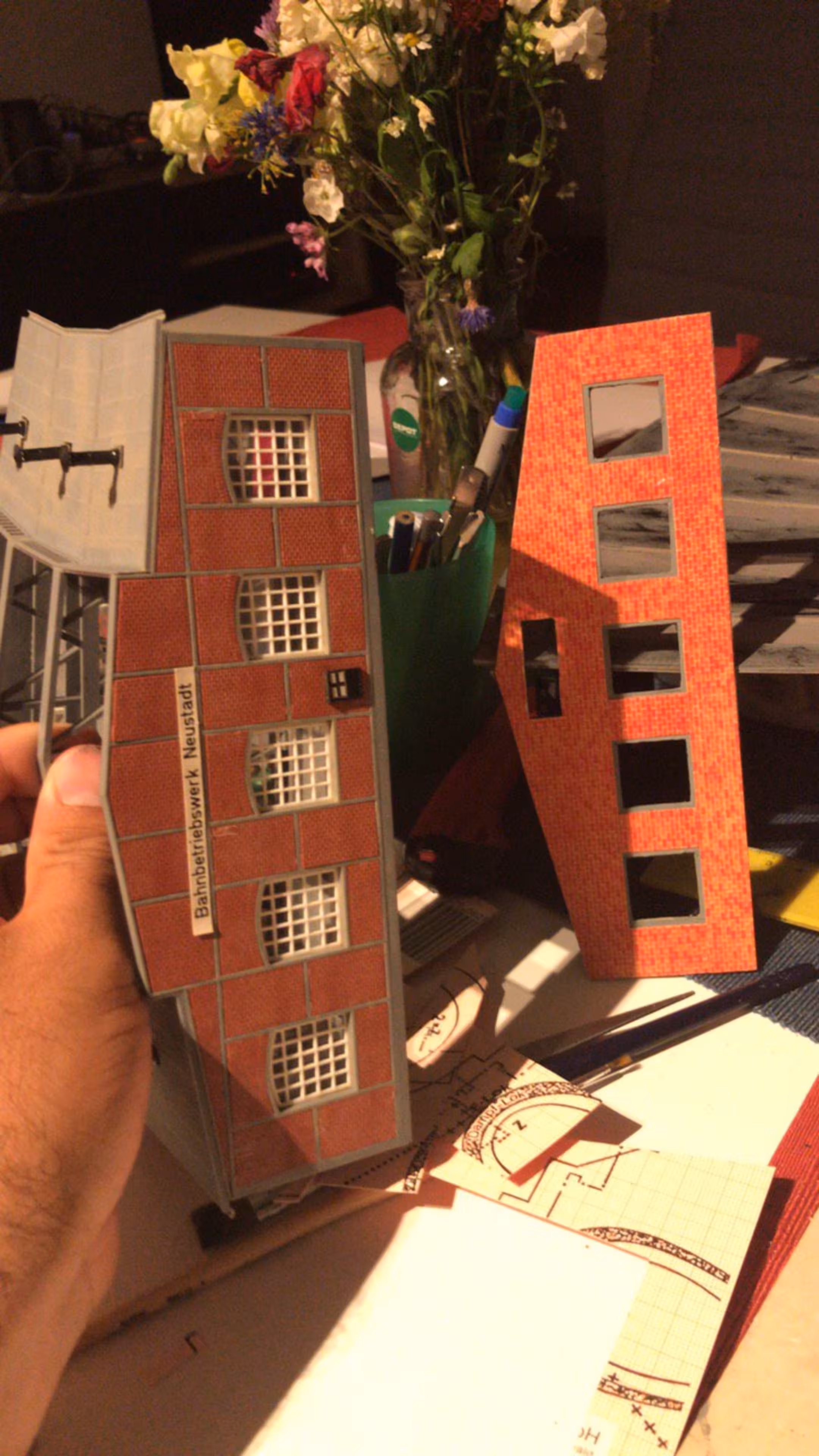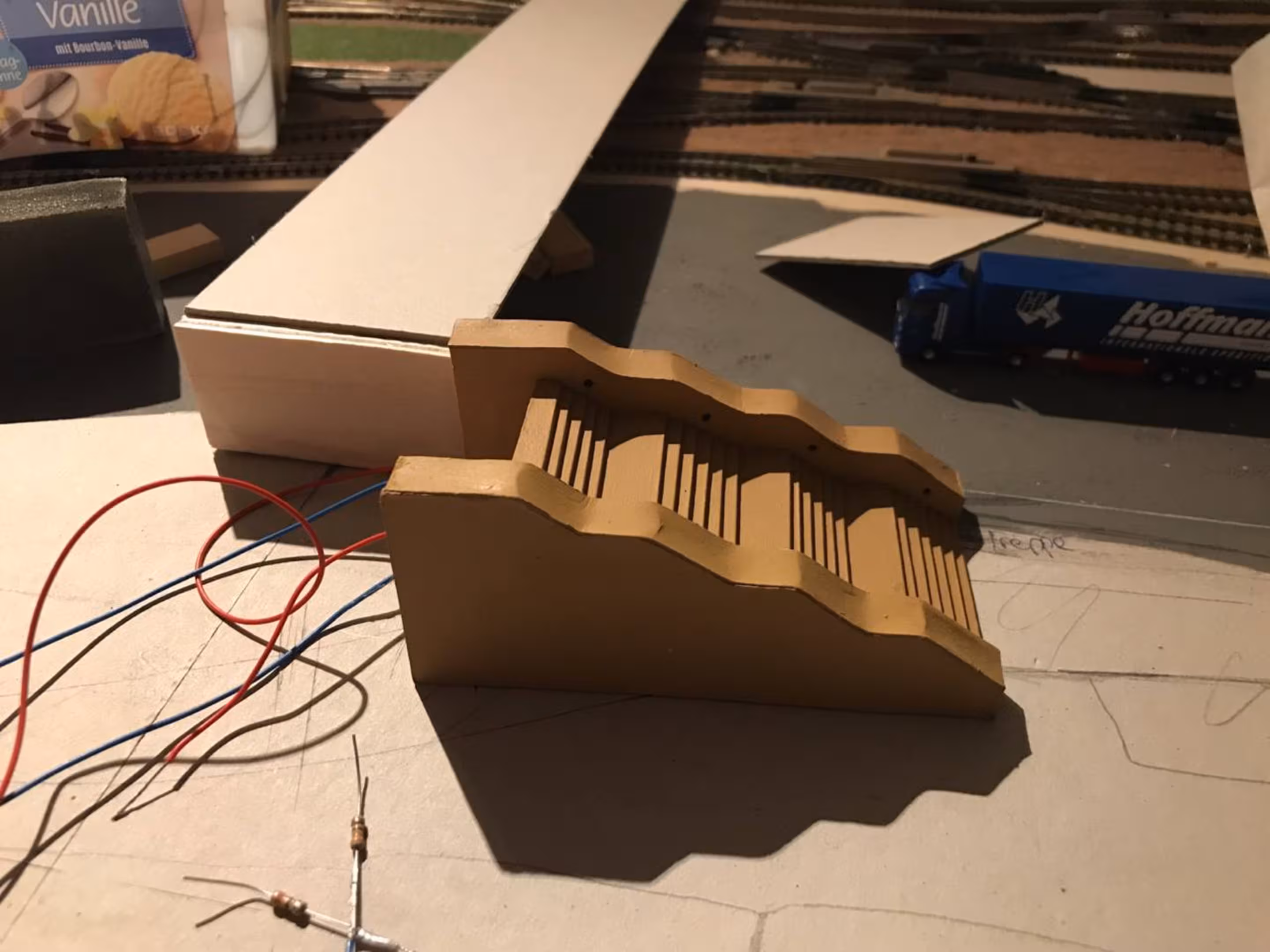 Schon hier begann Chris seine ersten Gehversuche in puncto "Eigenbau". So entstanden diverse Gebäude wie der Busbahnhof (in Anlehnung an den in Lahr), der Ringlokschuppen, Bahnsteigdächer, Postbahnsteig, das Widerlager zur "Wiwilí-Brücke" (entsprechend der in Freiburg), Signaltafeln und vieles mehr. Auch die Leuchten im Bahnbetriebswerk wurden aus Messingrohr und LEDs selbstgelötet!