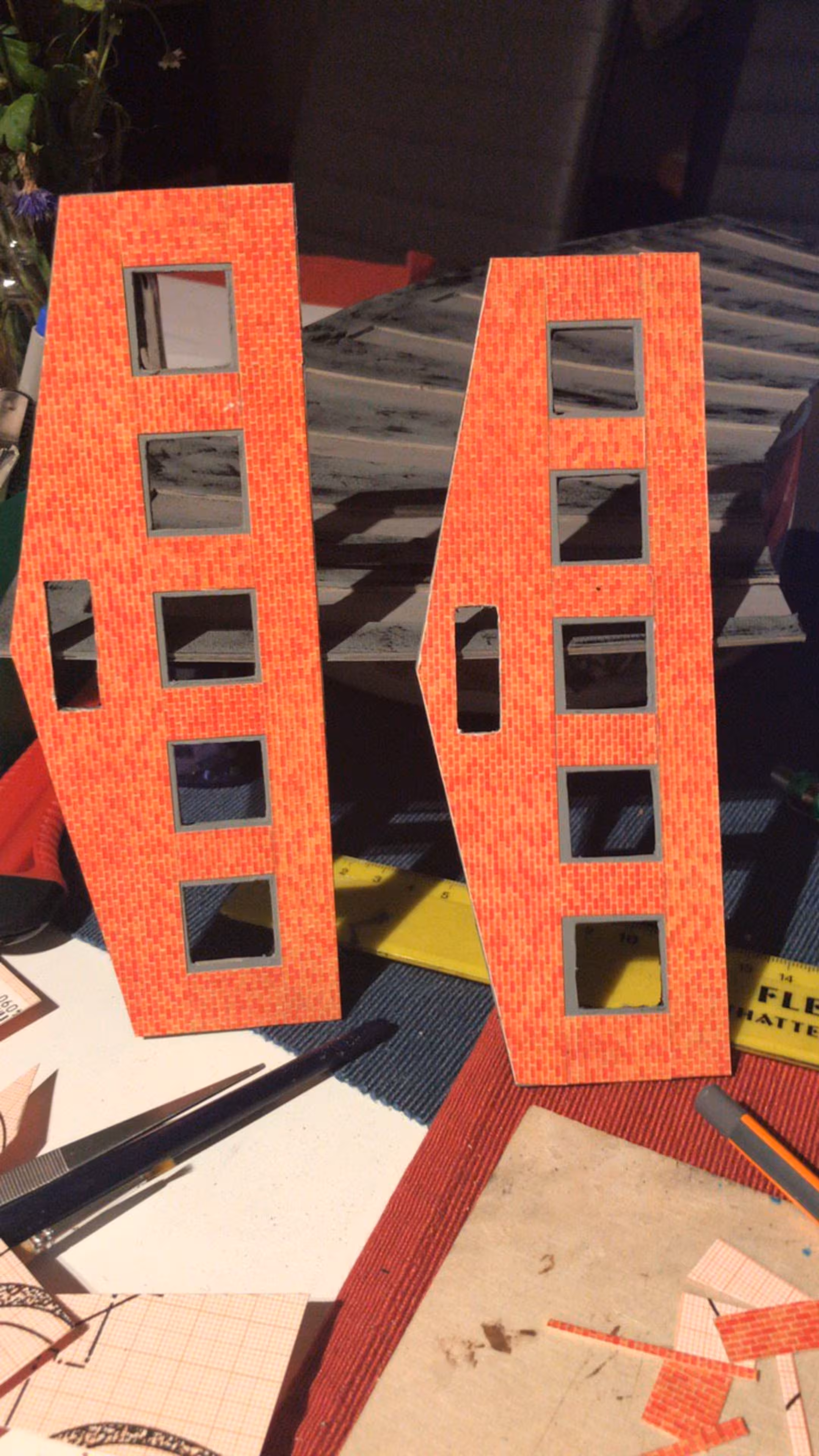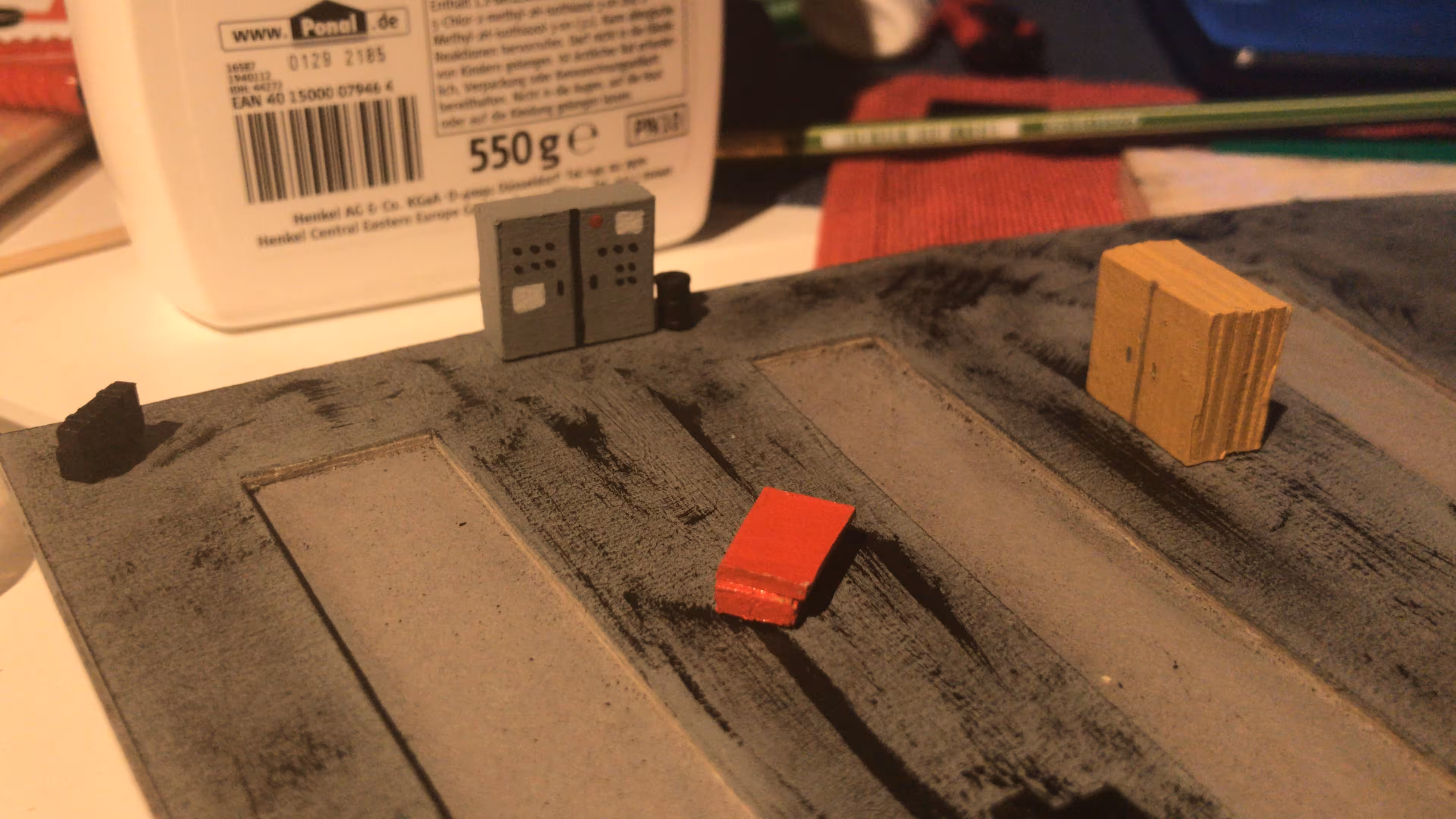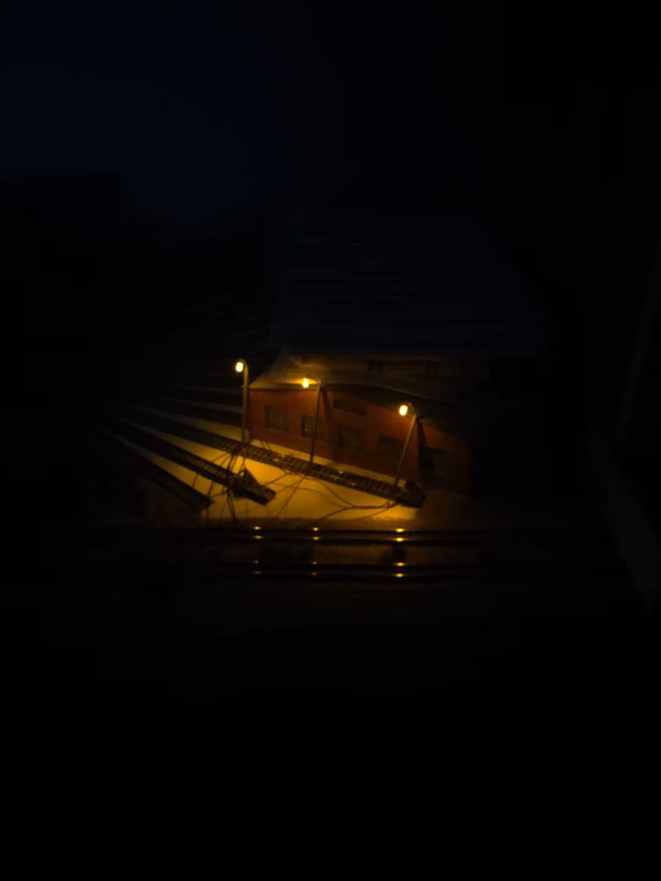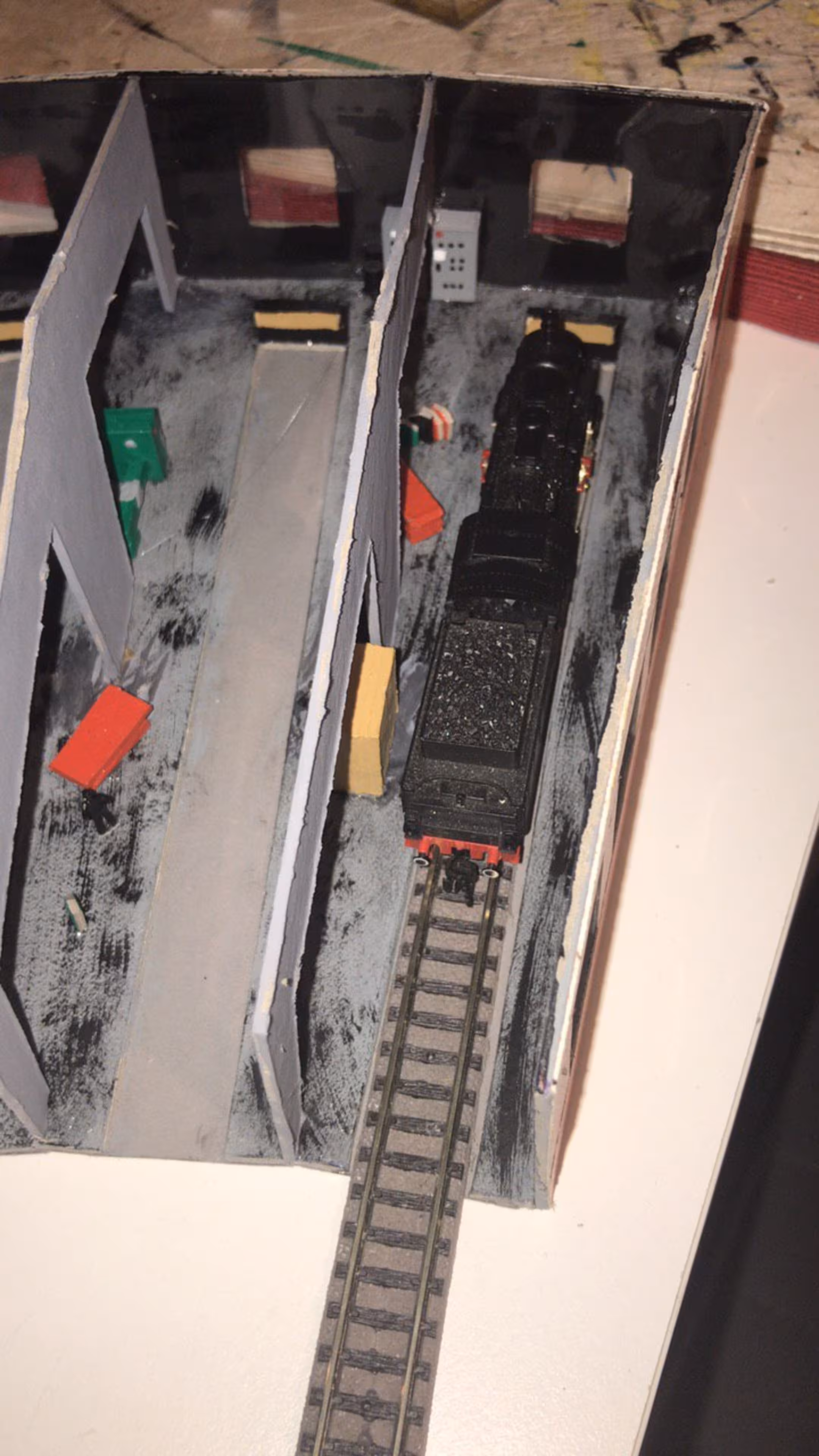 Schon hier begann Chris seine ersten Gehversuche in puncto "Eigenbau". So entstanden diverse Gebäude wie der Busbahnhof (in Anlehnung an den in Lahr), der Ringlokschuppen, Bahnsteigdächer, Postbahnsteig, das Widerlager zur "Wiwilí-Brücke" (entsprechend der in Freiburg), Signaltafeln und vieles mehr. Auch die Leuchten im Bahnbetriebswerk wurden aus Messingrohr und LEDs selbstgelötet!