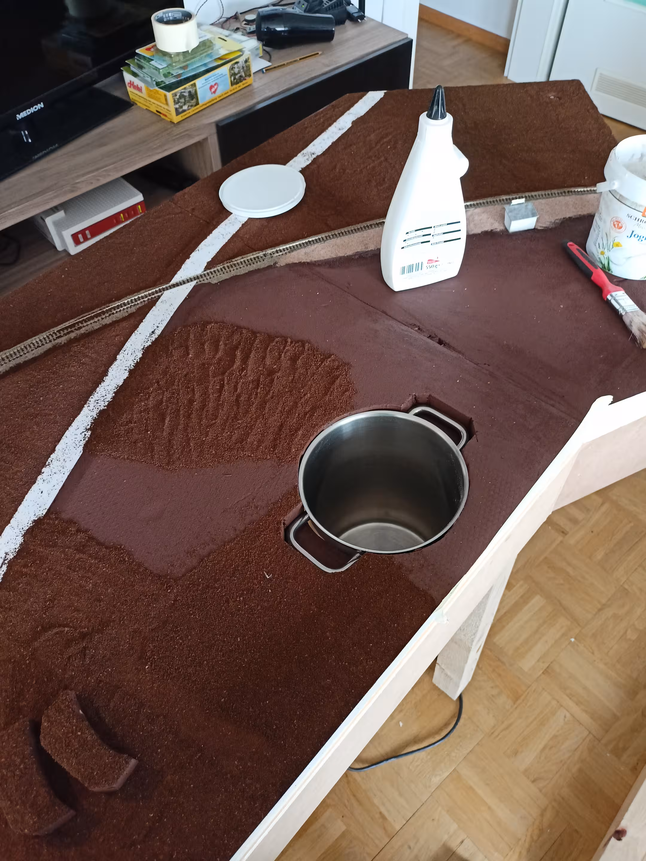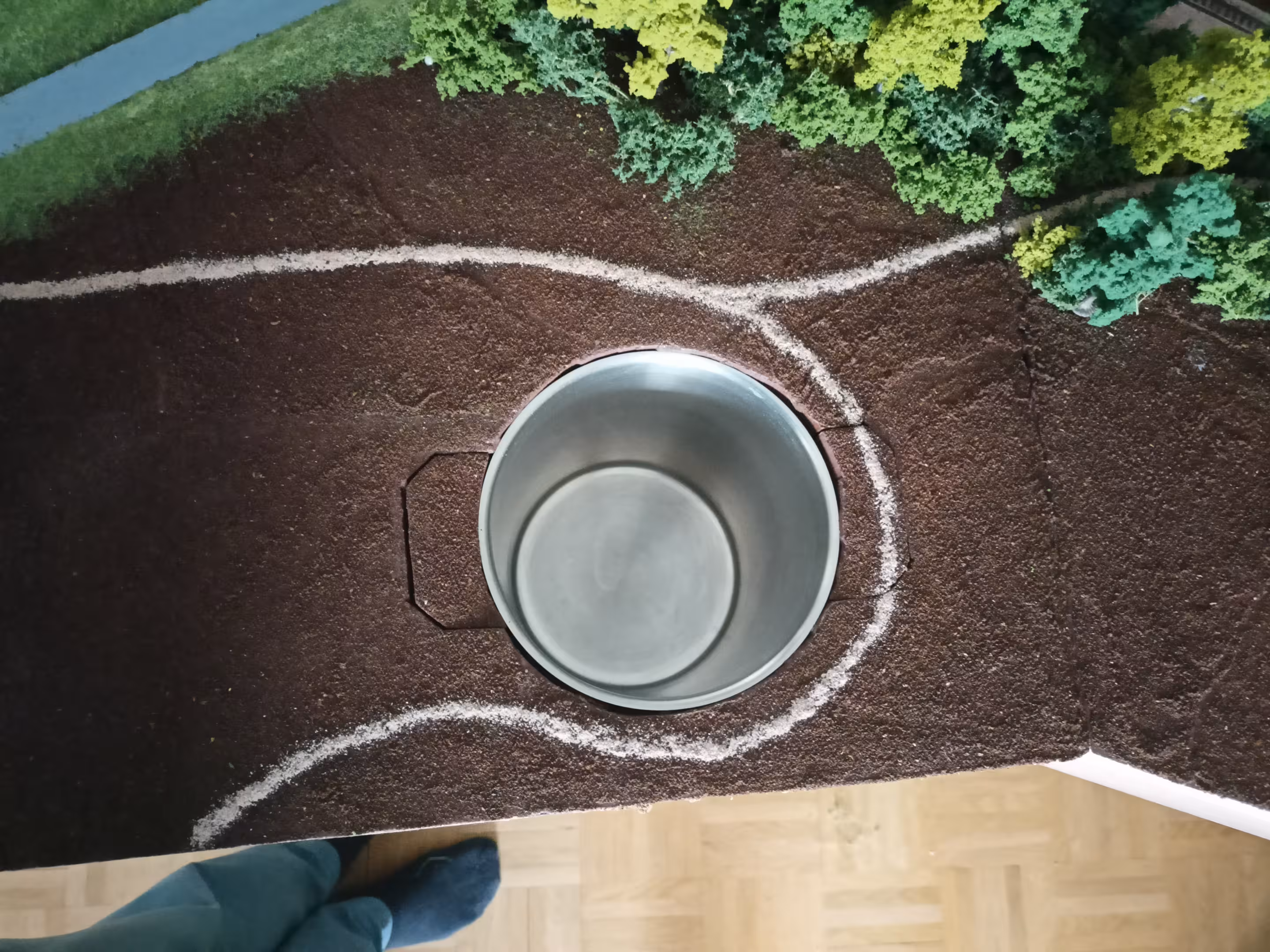 Geplant und bisher noch nicht umgesetzt ist eine Felsenlandschaft innerhalb des Topfes. Bei der letzten Ausstellung in Kirchzarten 2023 haben wir daher einfach Süßigkeiten drin versteckt. Jeder, der die Rebenanzahl in etwa richtig geschätzt hat, durfte dann einmal "einen Blick in den Topf werfen" und sich was aussuchen. Das kam so gut an, dass wir den Plan, darin eine Landschaft einzubauen, in Frage stellten. Potentiell ließe sich aber eine Landschaft einsetzten, die jederzeit herausnehmbar wäre.