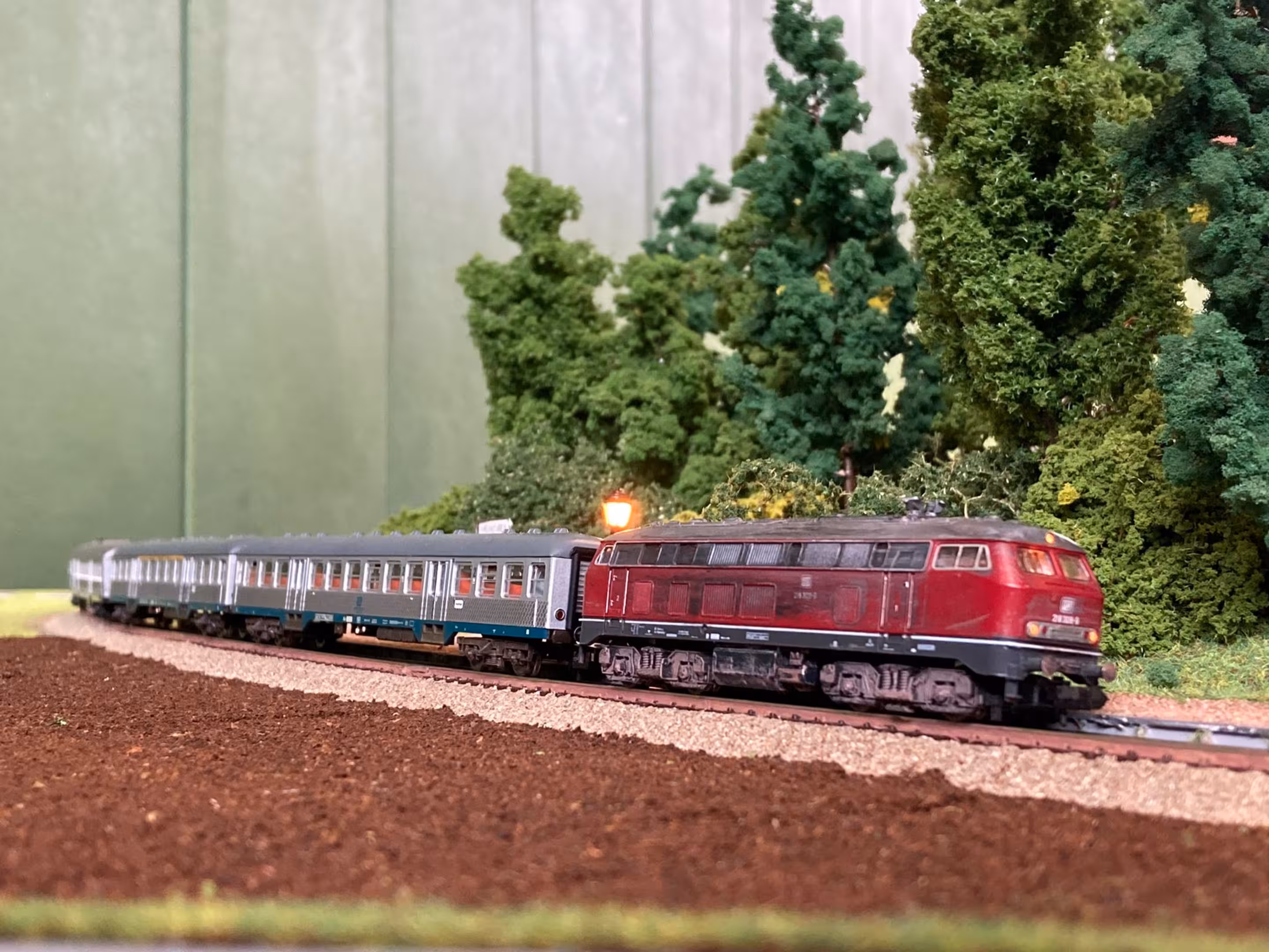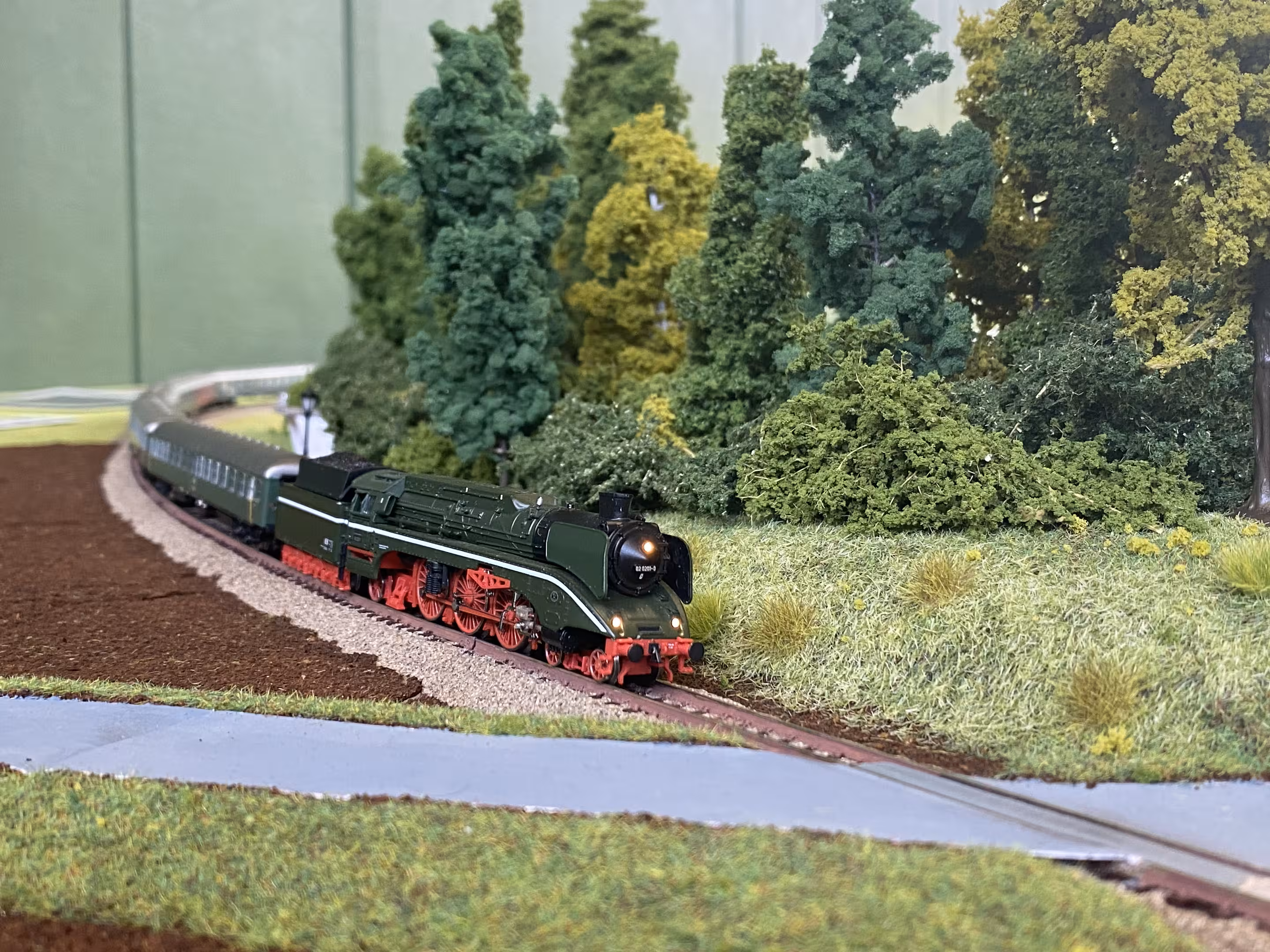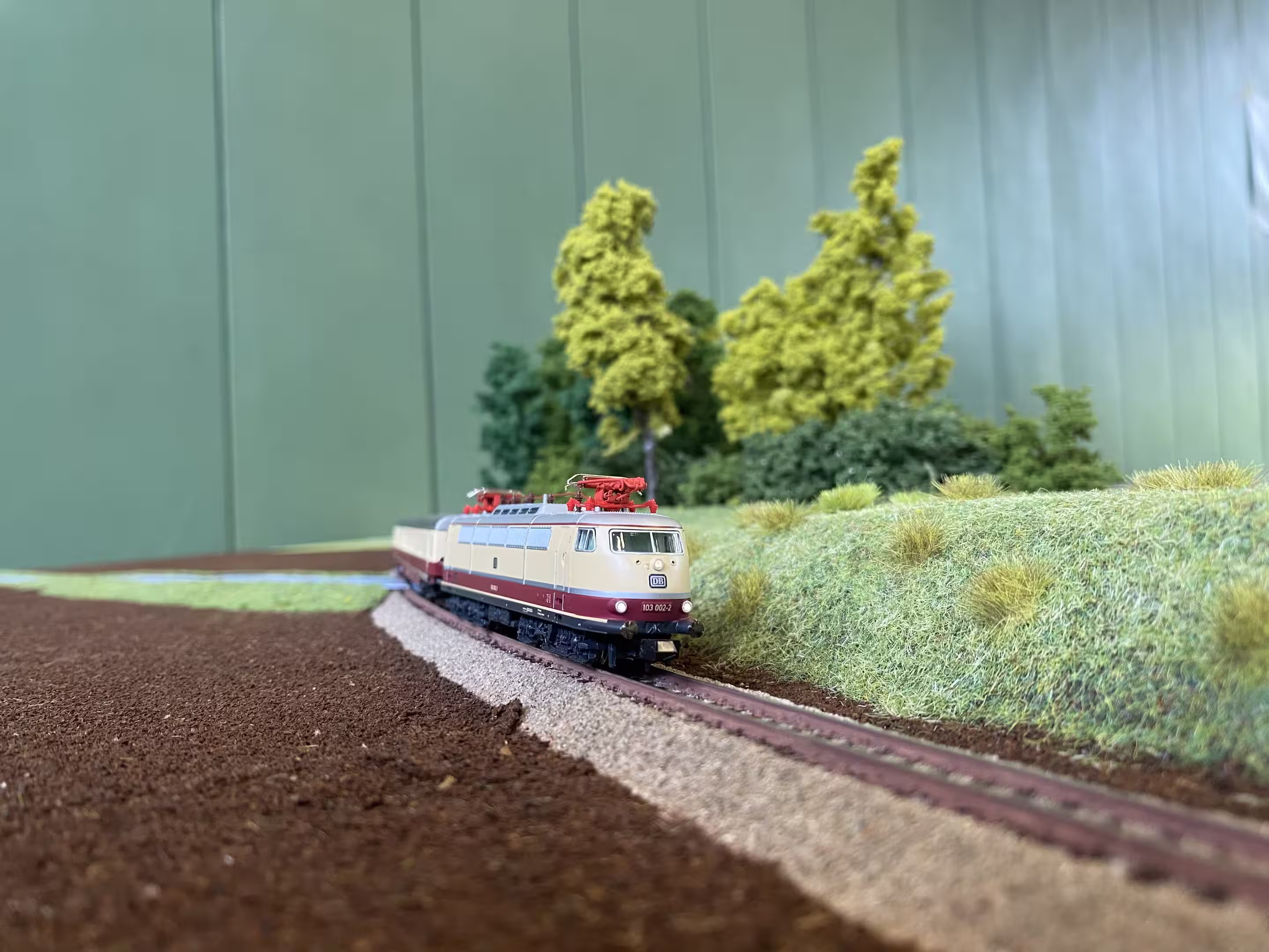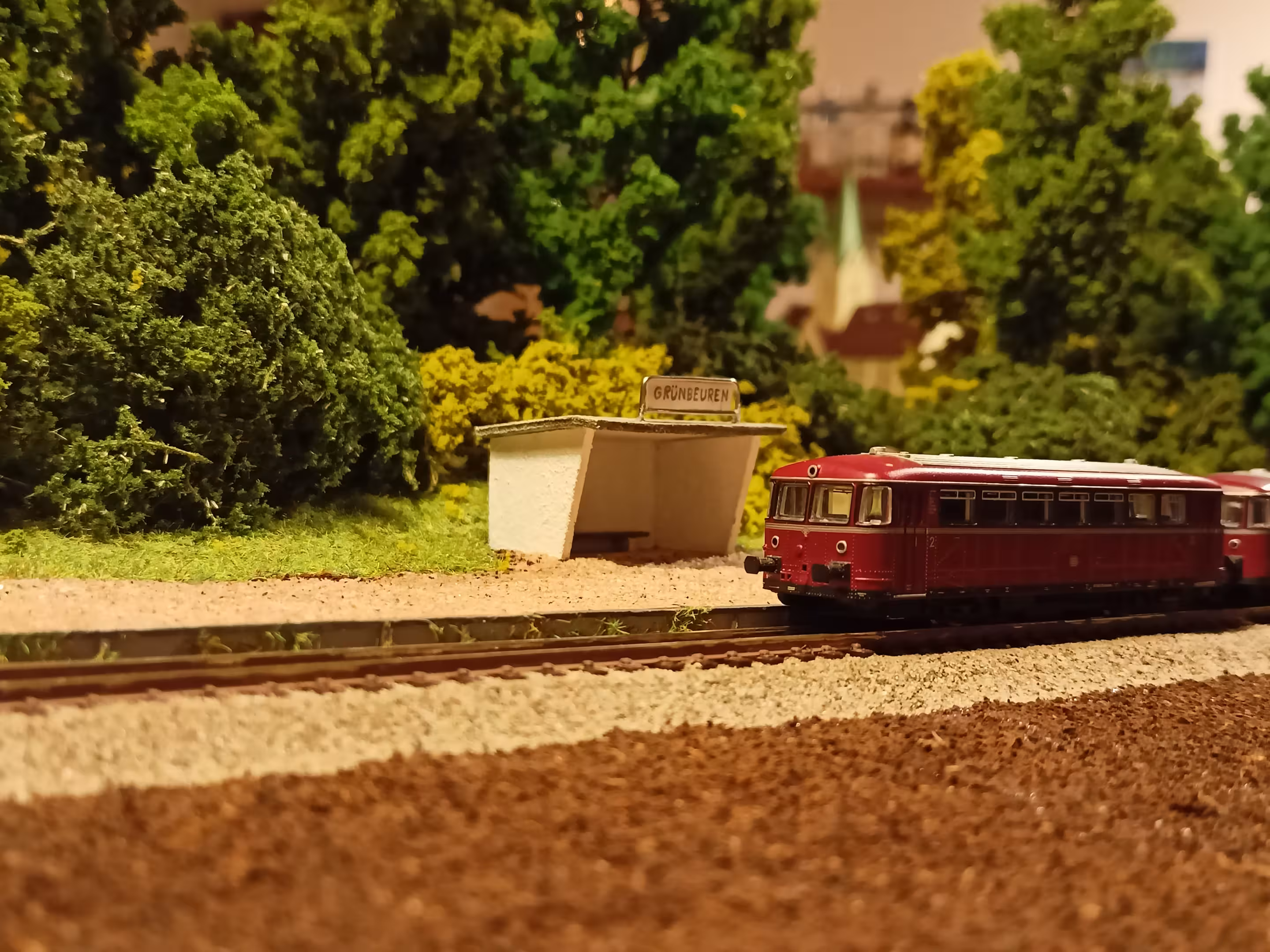 Da an Blaubeuren weder Bahnstrecke noch ein Haltepunkt existiert, musste mal wieder ein anderer Name her… Wie gut, dass der Farbraum noch etwas größer ist und so bot sich die Farbe Grün an. Zunächst noch ohne Halt geplant, änderte sich dies, als Chris die Frage stellte: „Und sollen da auch Züge halten?” Hm… Warum eigentlich nicht? Es muss ja nichts Großes sein! Ein kleiner Bahnsteig und ein Unterstand reichen ja vollkommen… So etwas in die Richtung hatte Marcel für ein "generelles Überlandsegment" schonmal angedacht. Warum also nicht schon hier implementieren? Nach etwas Suchen im Netz fand Marcel das Häuschen, dass er von einer anderen Recherche noch im Kopf hatte: Der Haltepunkt Berenbach.