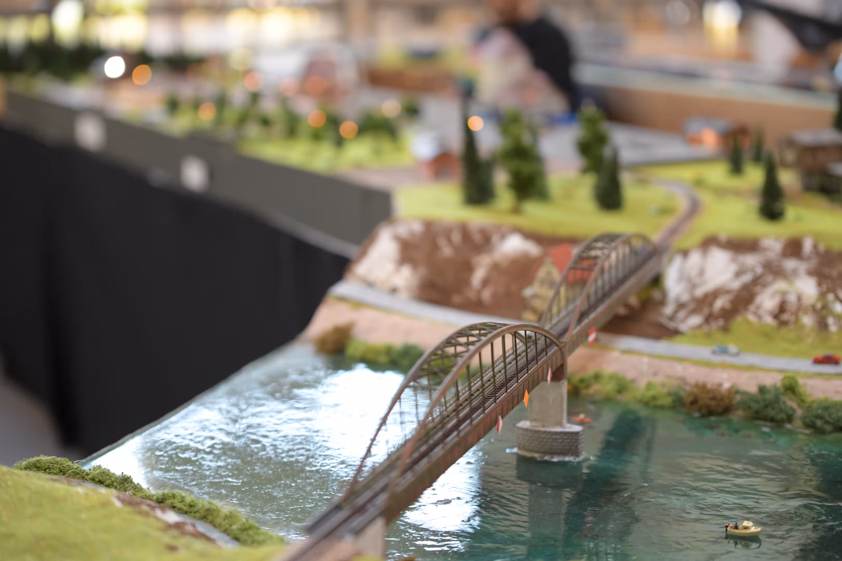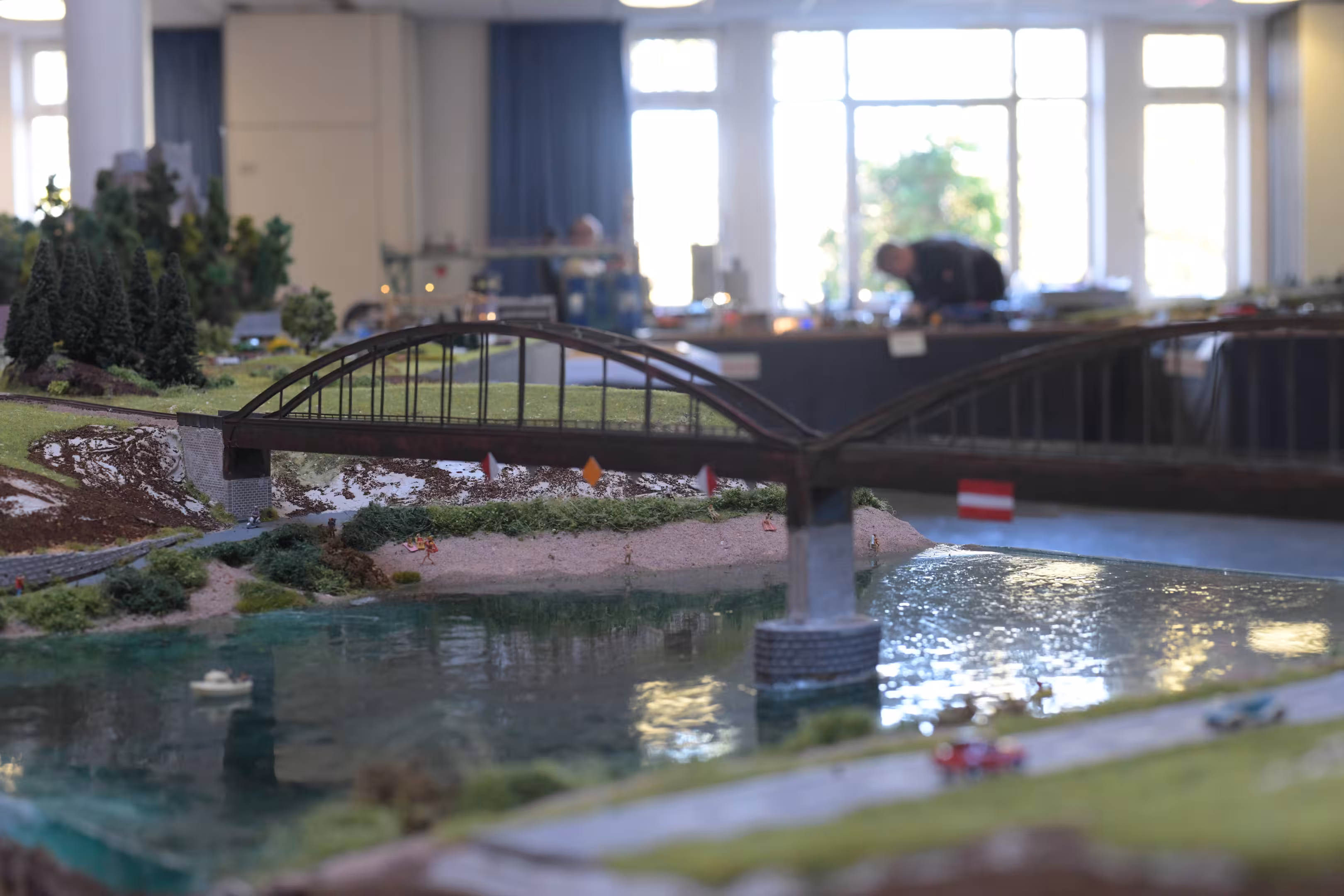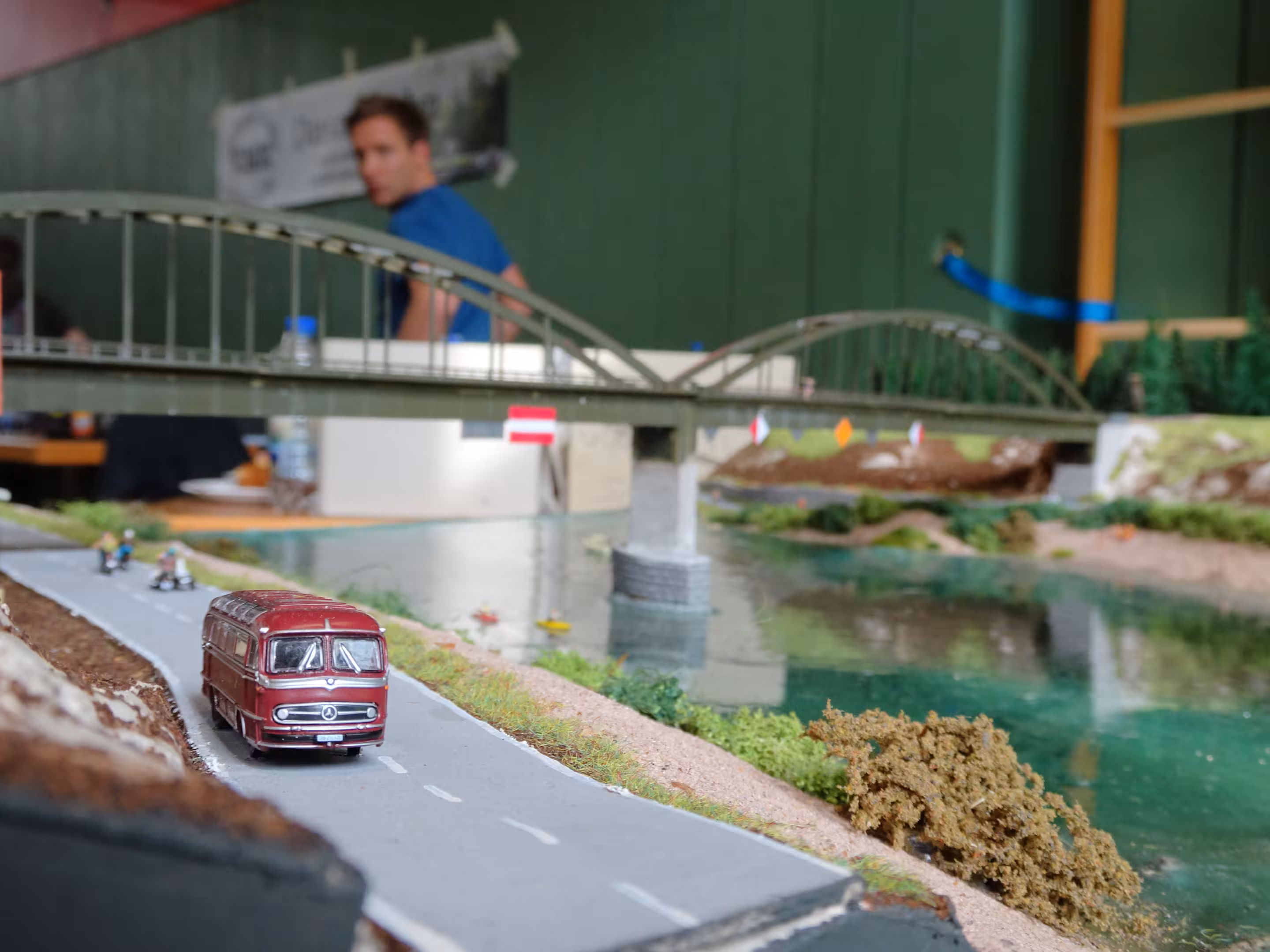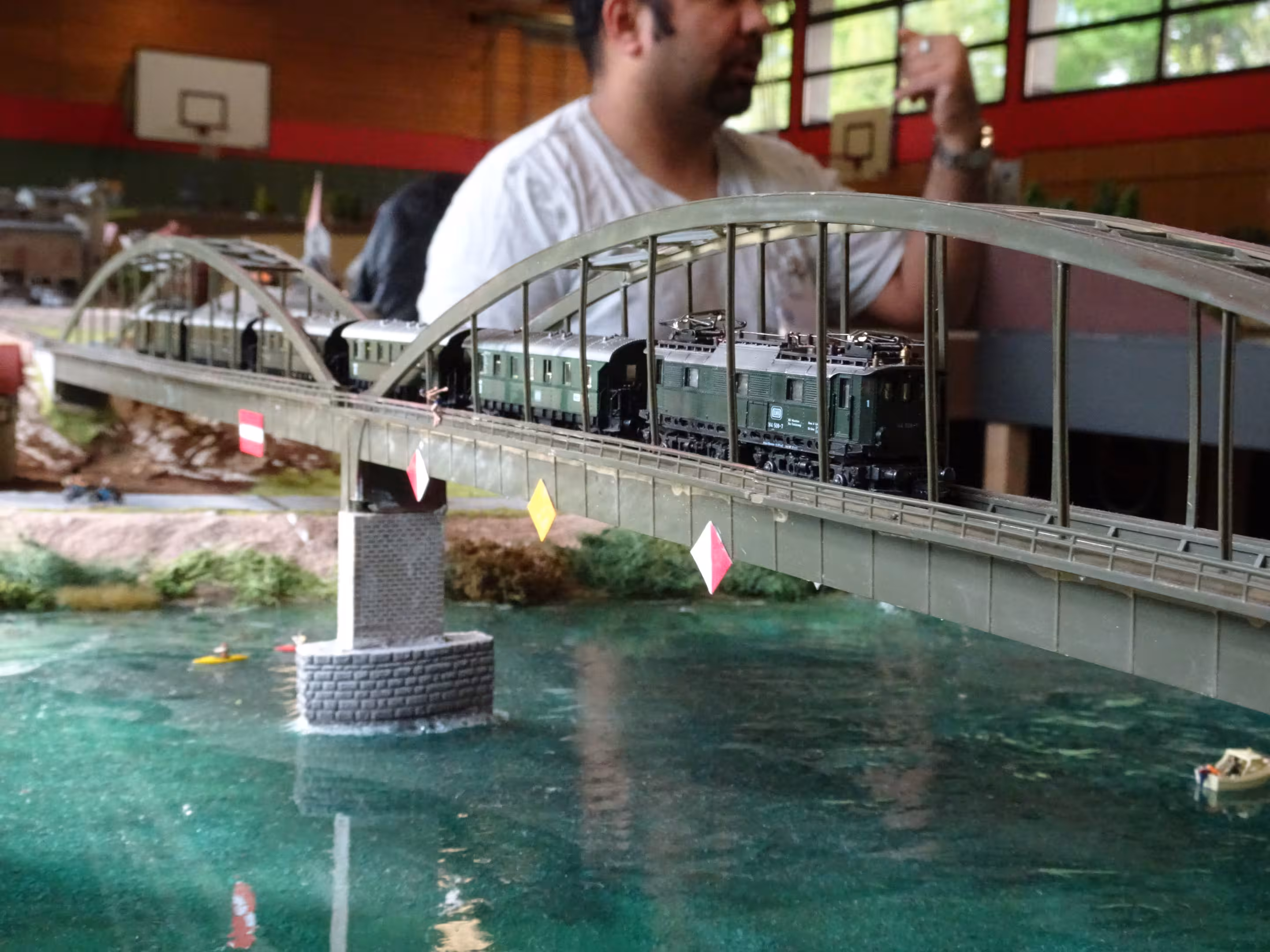 Dies war unser zweiter Versuch, mit Epoxyd-Harz zu arbeiten. Da bei unserem ersten Fluss (der Achtsam bei Dasneburg) die Farbe etwas zu dunkel geworden ist, sind wir hier nun vorsichtiger vorgegangen. Das hat soweit auch geklappt, dennoch gibt es auch hier wieder ein Lessons-learned: So großflächig sollte man in dieser Stärke nicht auf einmal gießen. Zum Glück haben sich bei uns keine Risse gebildet, dafür hat der ganze Holzrahmen nachgegeben: Die Seiten sind nun leider nach oben gezogen. Im Gesamtarrangement funktioniert das Modul glücklicherweise dennoch. Die Brücke haben wir in der Mitte nochmal angehoben, damit die Strecke wenigstens hier eben verläuft.