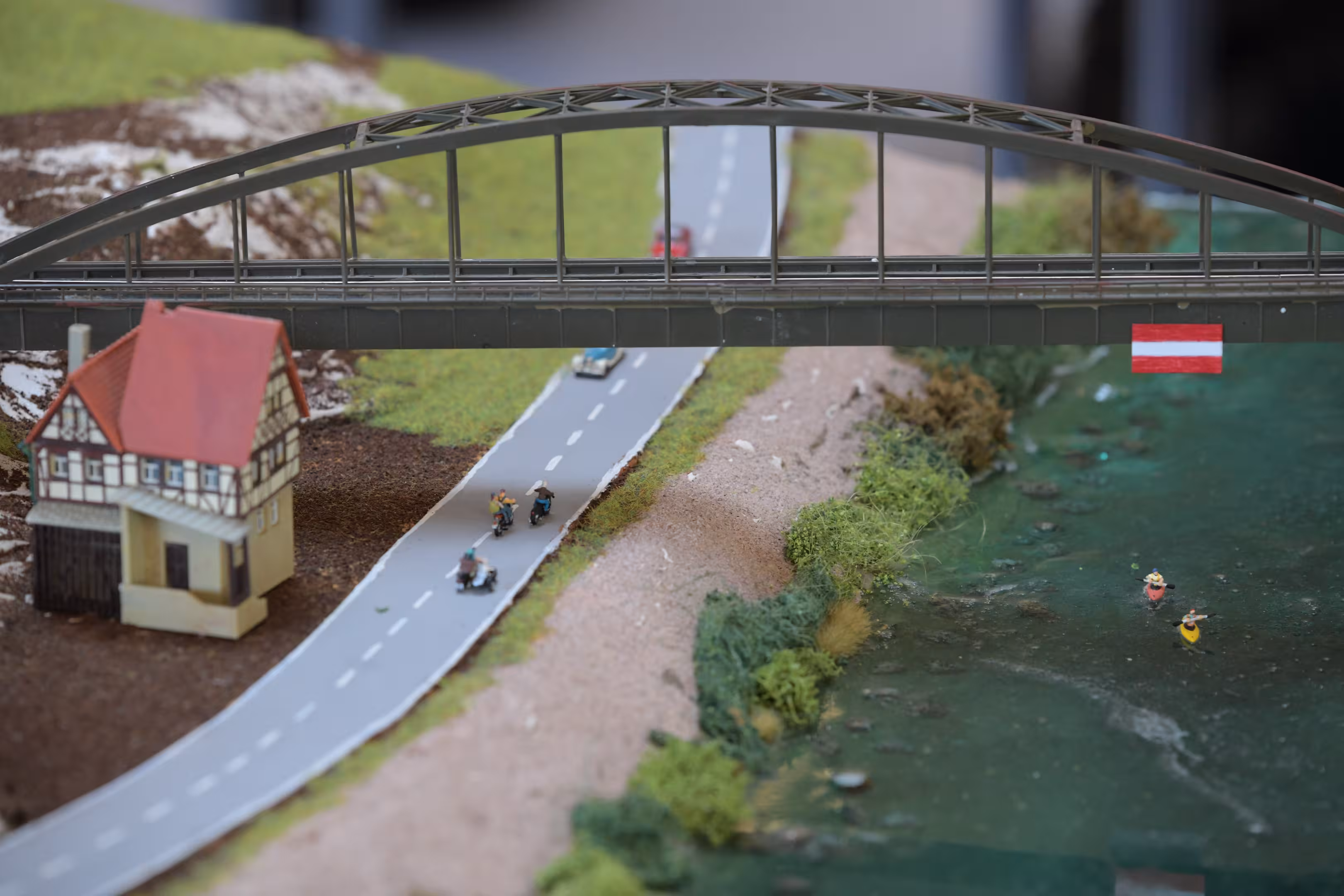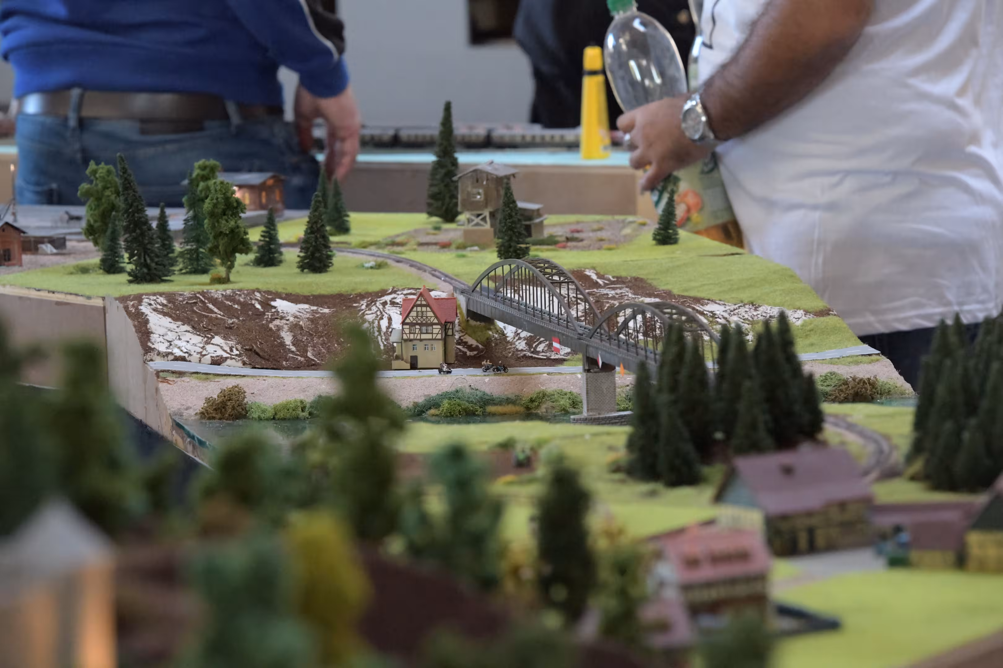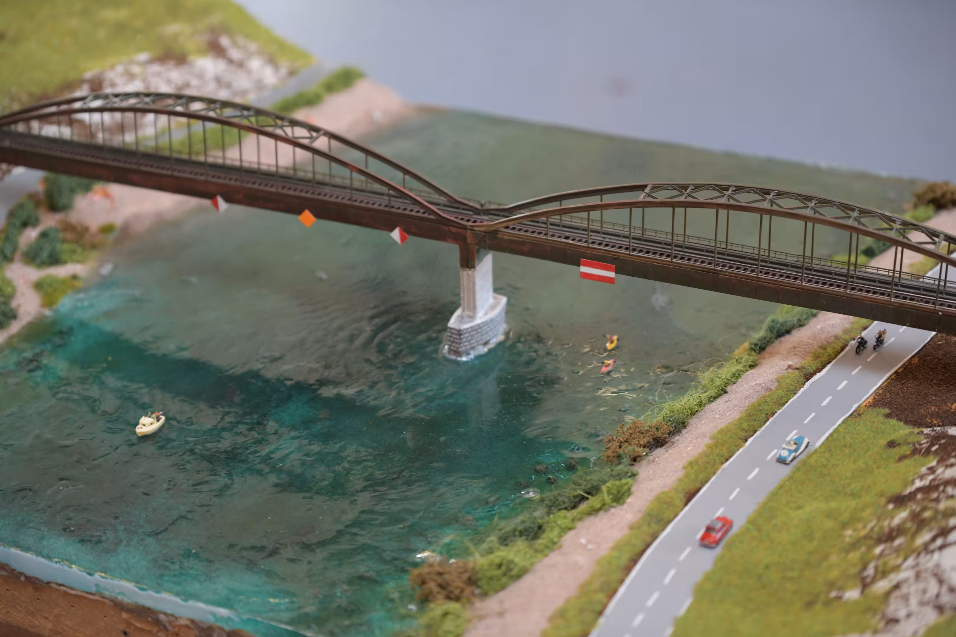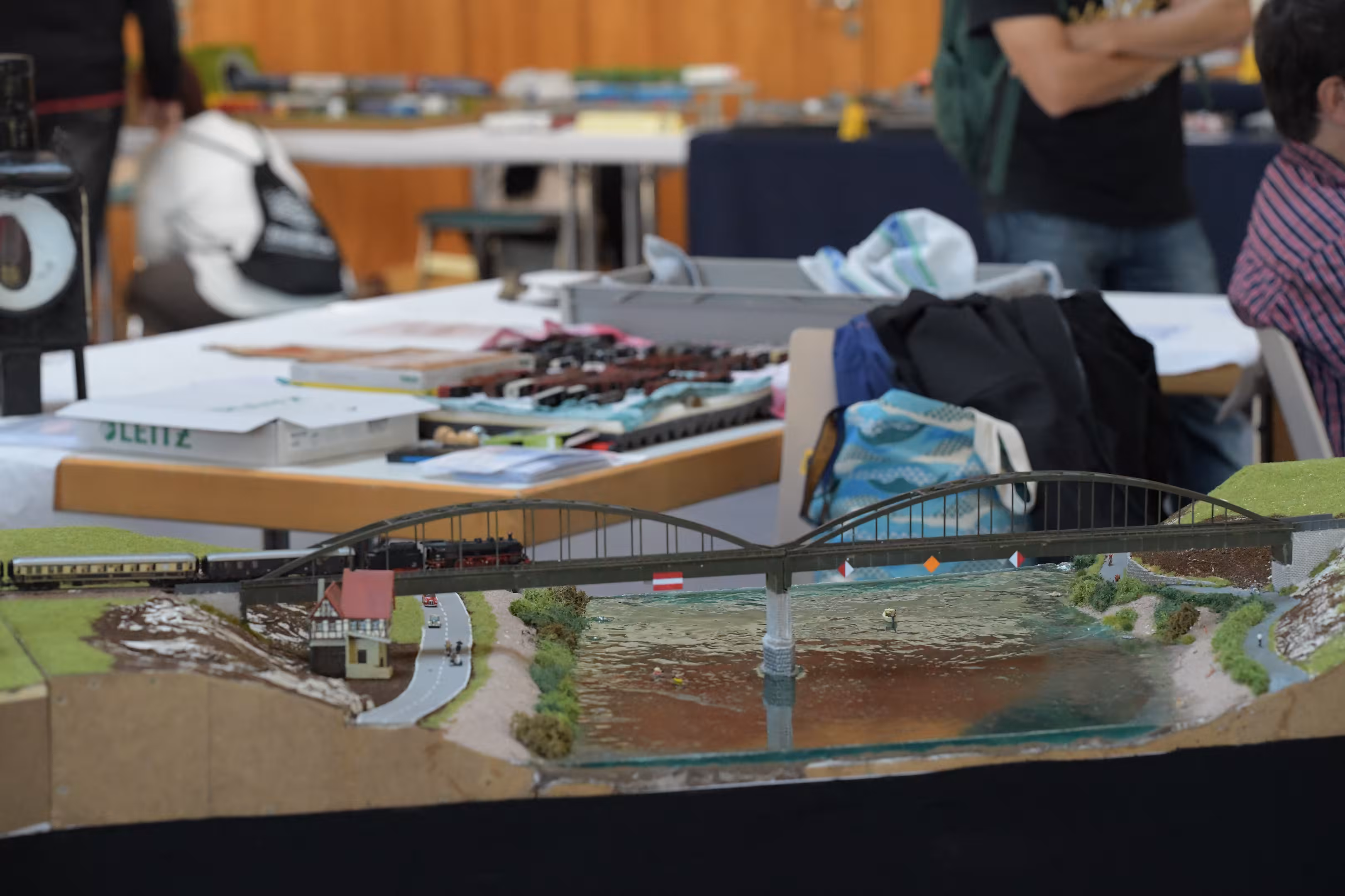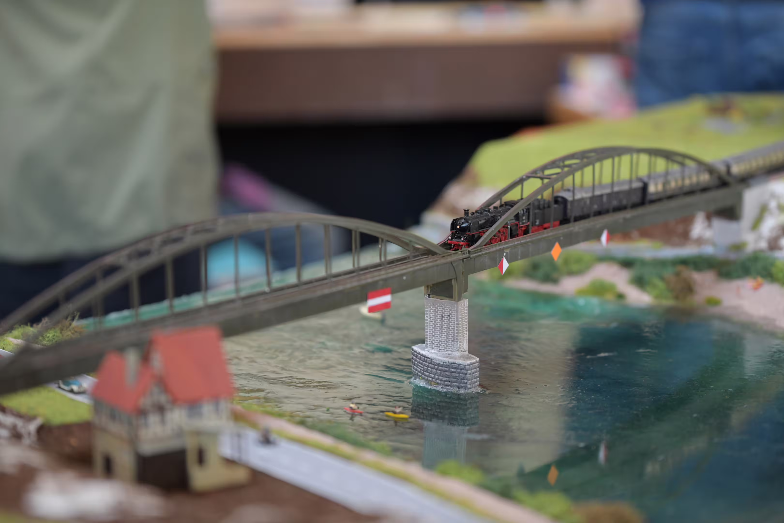 Dies war unser zweiter Versuch, mit Epoxyd-Harz zu arbeiten. Da bei unserem ersten Fluss (der Achtsam bei Dasneburg) die Farbe etwas zu dunkel geworden ist, sind wir hier nun vorsichtiger vorgegangen. Das hat soweit auch geklappt, dennoch gibt es auch hier wieder ein Lessons-learned: So großflächig sollte man in dieser Stärke nicht auf einmal gießen. Zum Glück haben sich bei uns keine Risse gebildet, dafür hat der ganze Holzrahmen nachgegeben: Die Seiten sind nun leider nach oben gezogen. Im Gesamtarrangement funktioniert das Modul glücklicherweise dennoch. Die Brücke haben wir in der Mitte nochmal angehoben, damit die Strecke wenigstens hier eben verläuft.