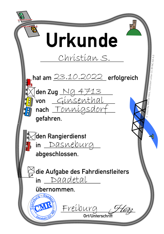 Umrandet wird die Urkunde von einer Eisenbahnstrecke, die vorbei an einigen verspielt dargestellten Motiven führt. Bei genauerer Betrachtung kann man hier drei Motive unserer Anlage wiedererkennen: