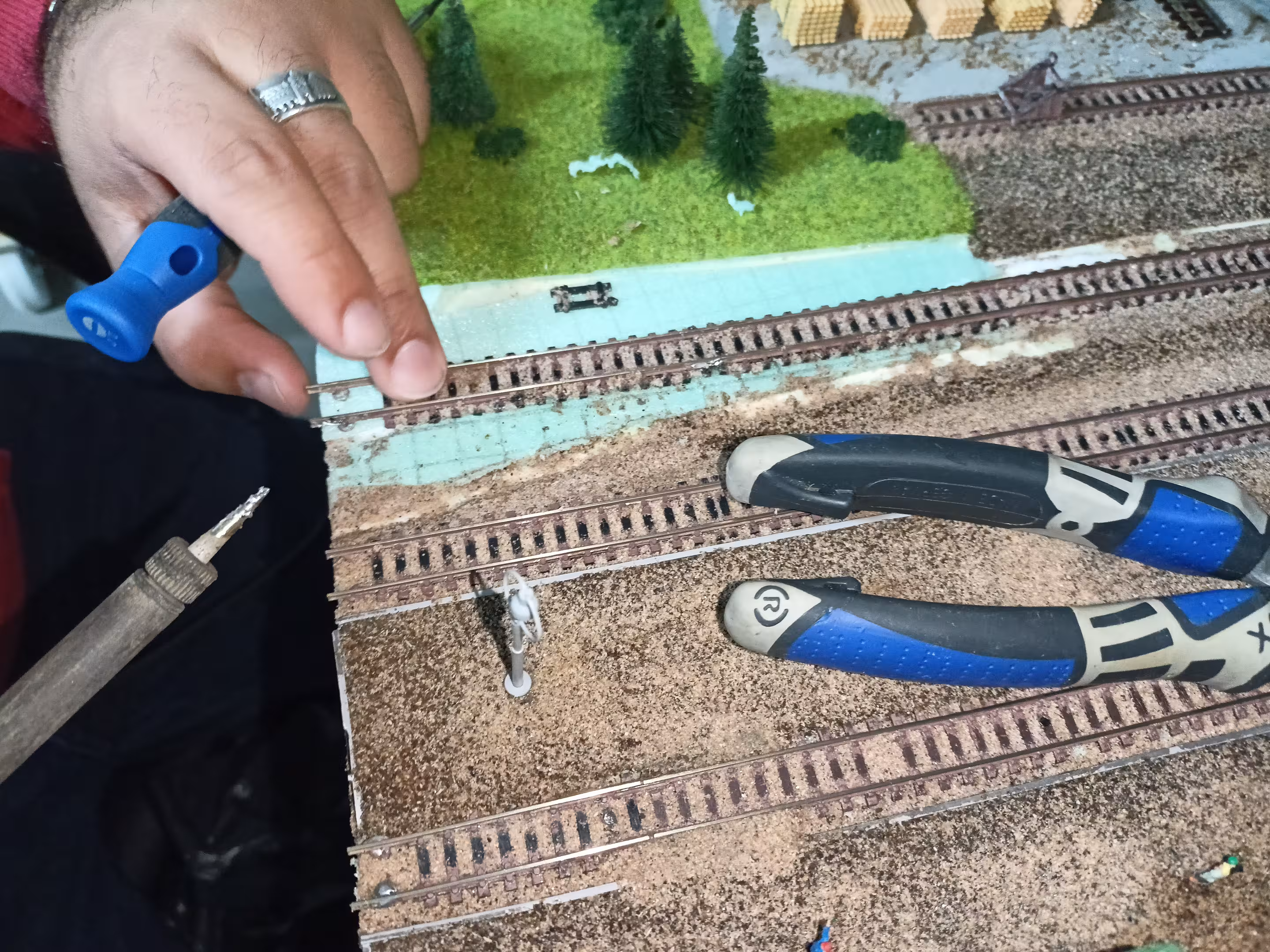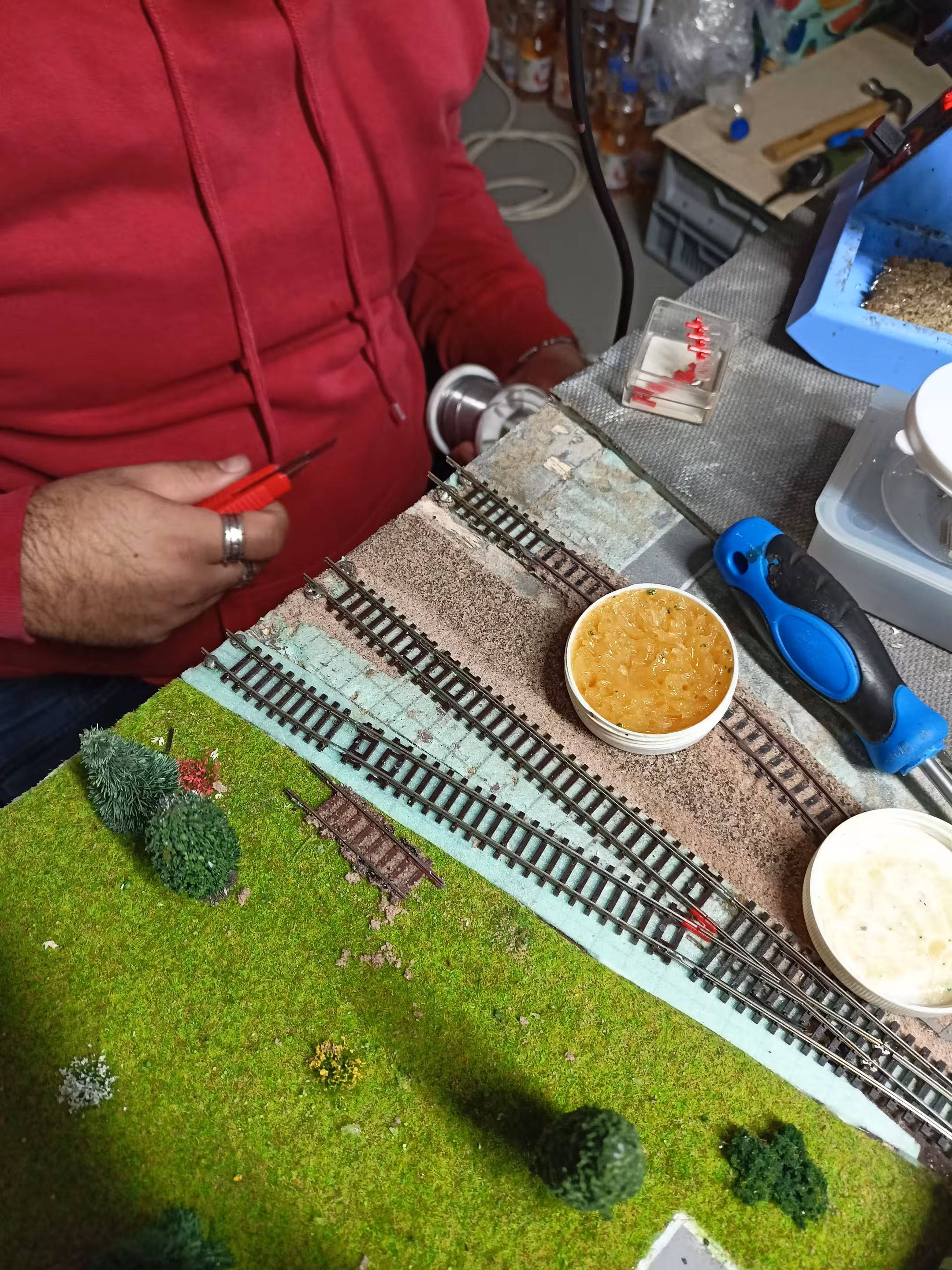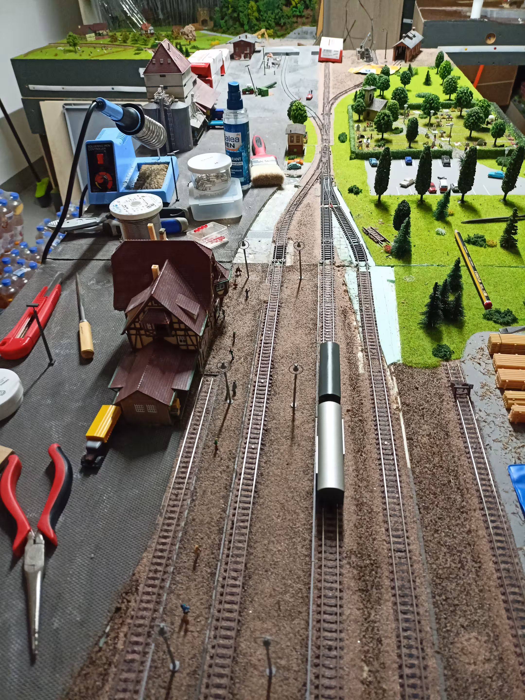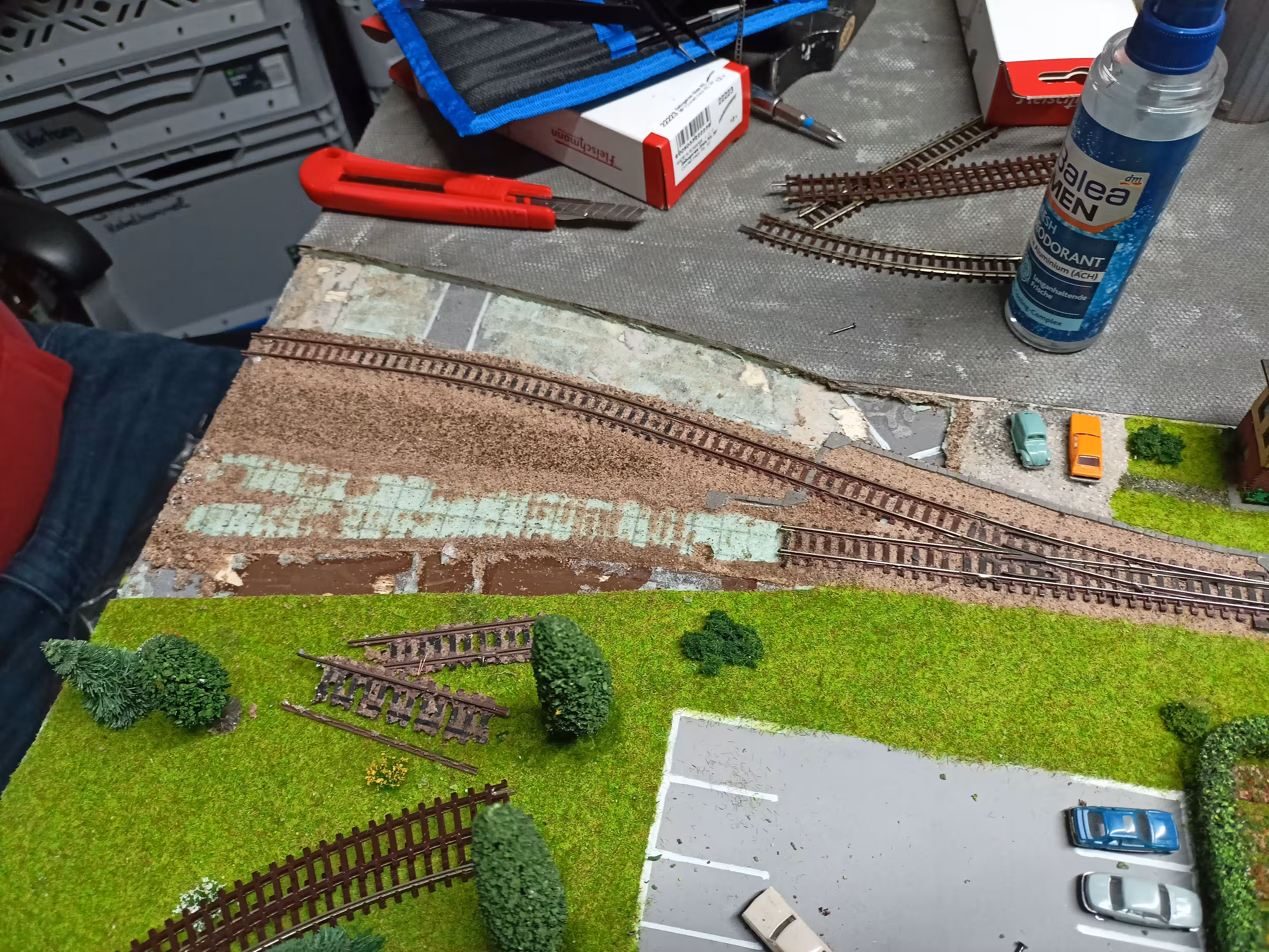 Das haben wir heute zusammen mit Mika erledigt, der damit zum ersten Mal sich auch gestalterisch an der Anlage ausprobieren konnte! Nach dem Anpassen aller Gleise muss noch die Landschaft wieder korrigiert werden. Das lässt sich aber in einem machen, wenn das Mittelsegment gestaltet wird.