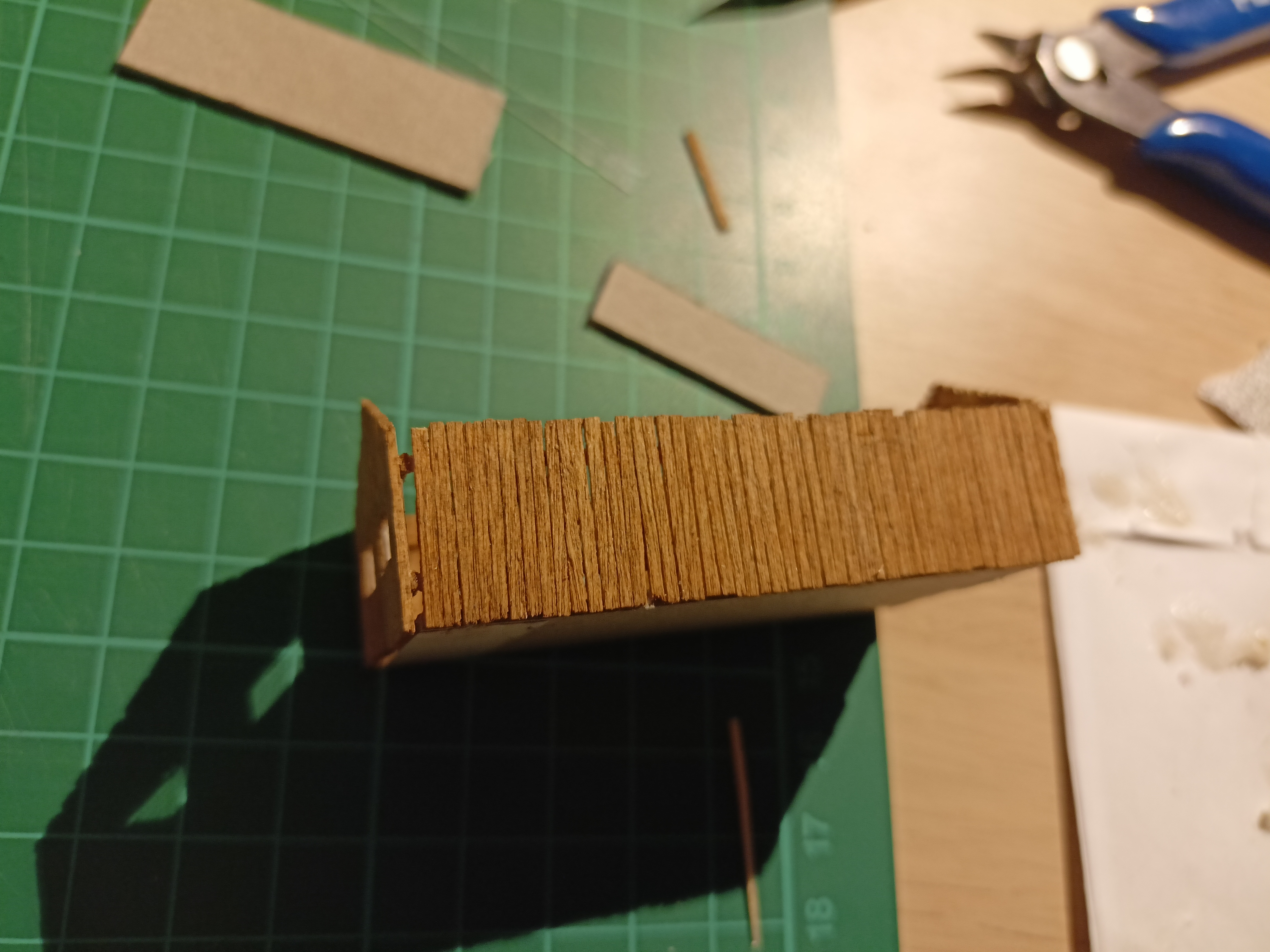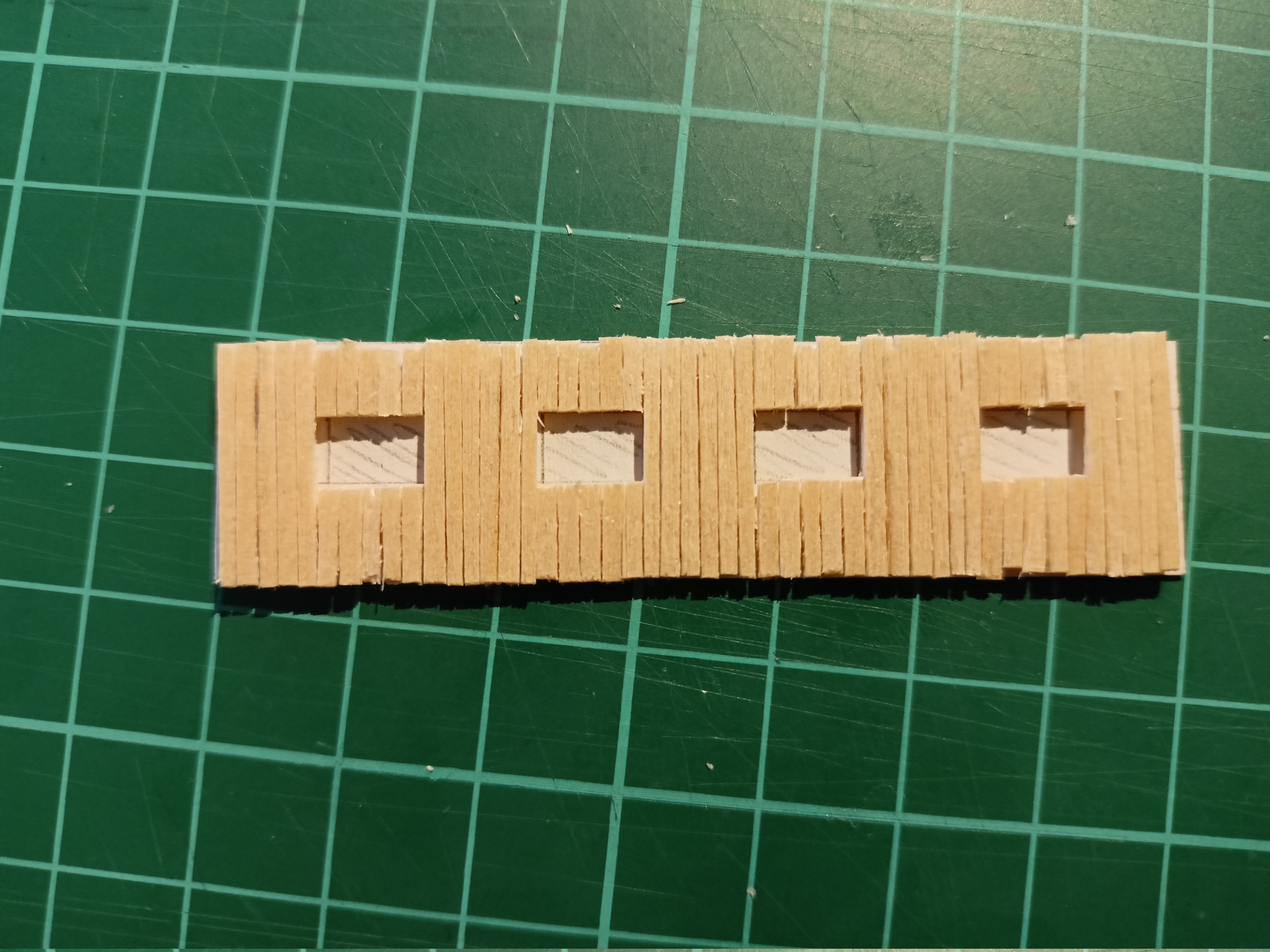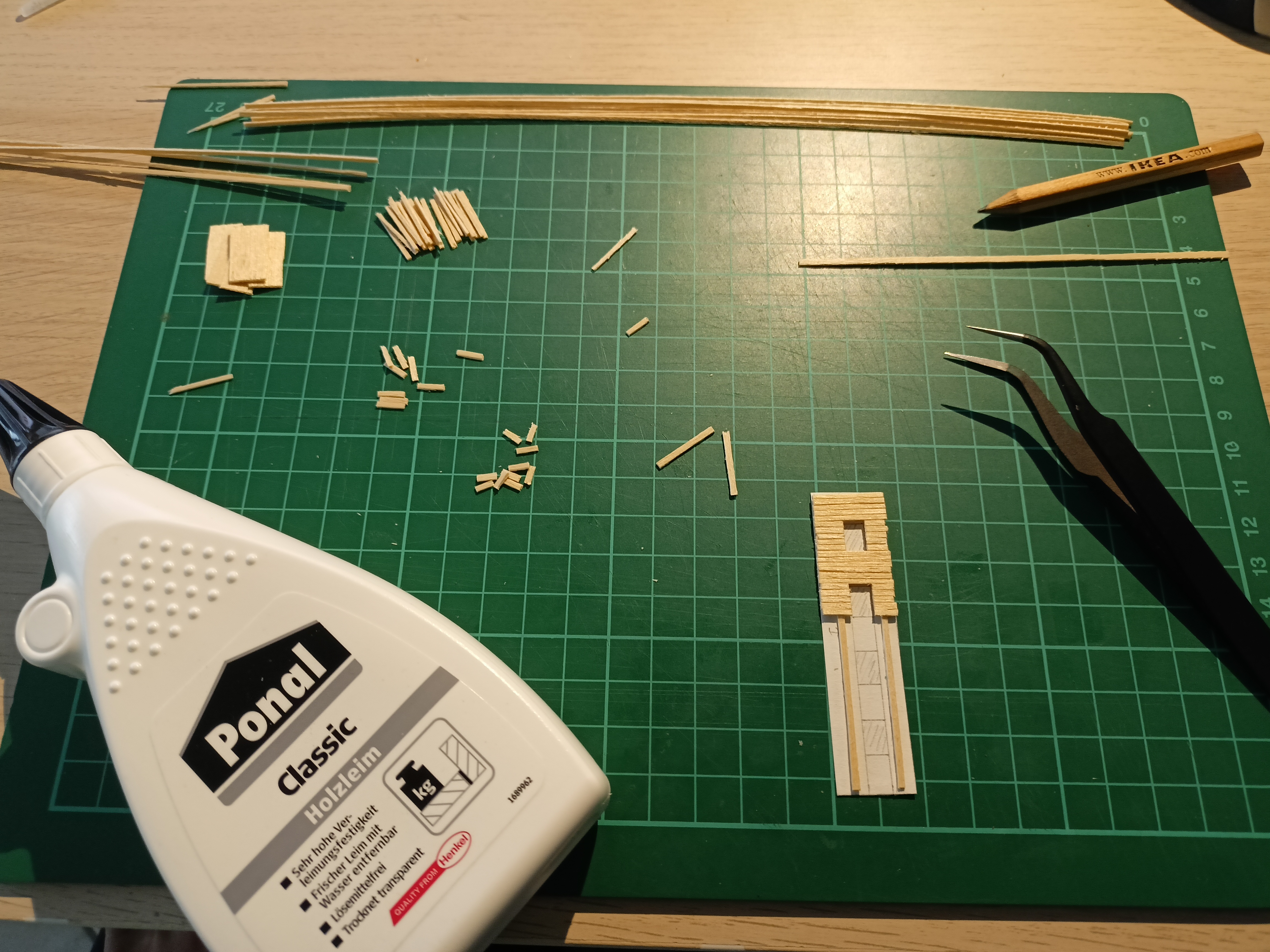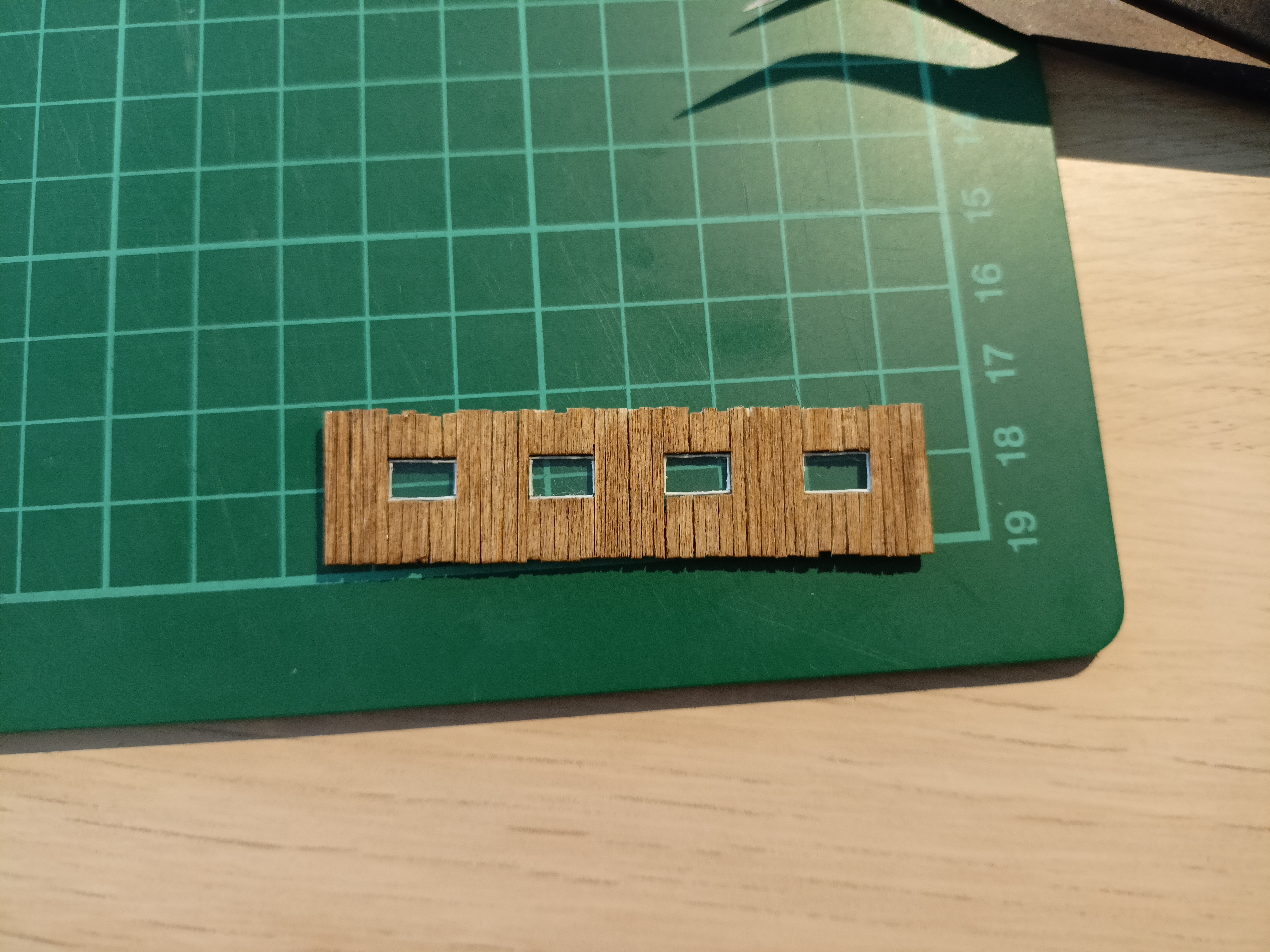 und einige ca. 17mm breite Stücke, die dann einfacher in 1mm-Streifen geschnitten werden können, um die Außenbretter zu bekommen.