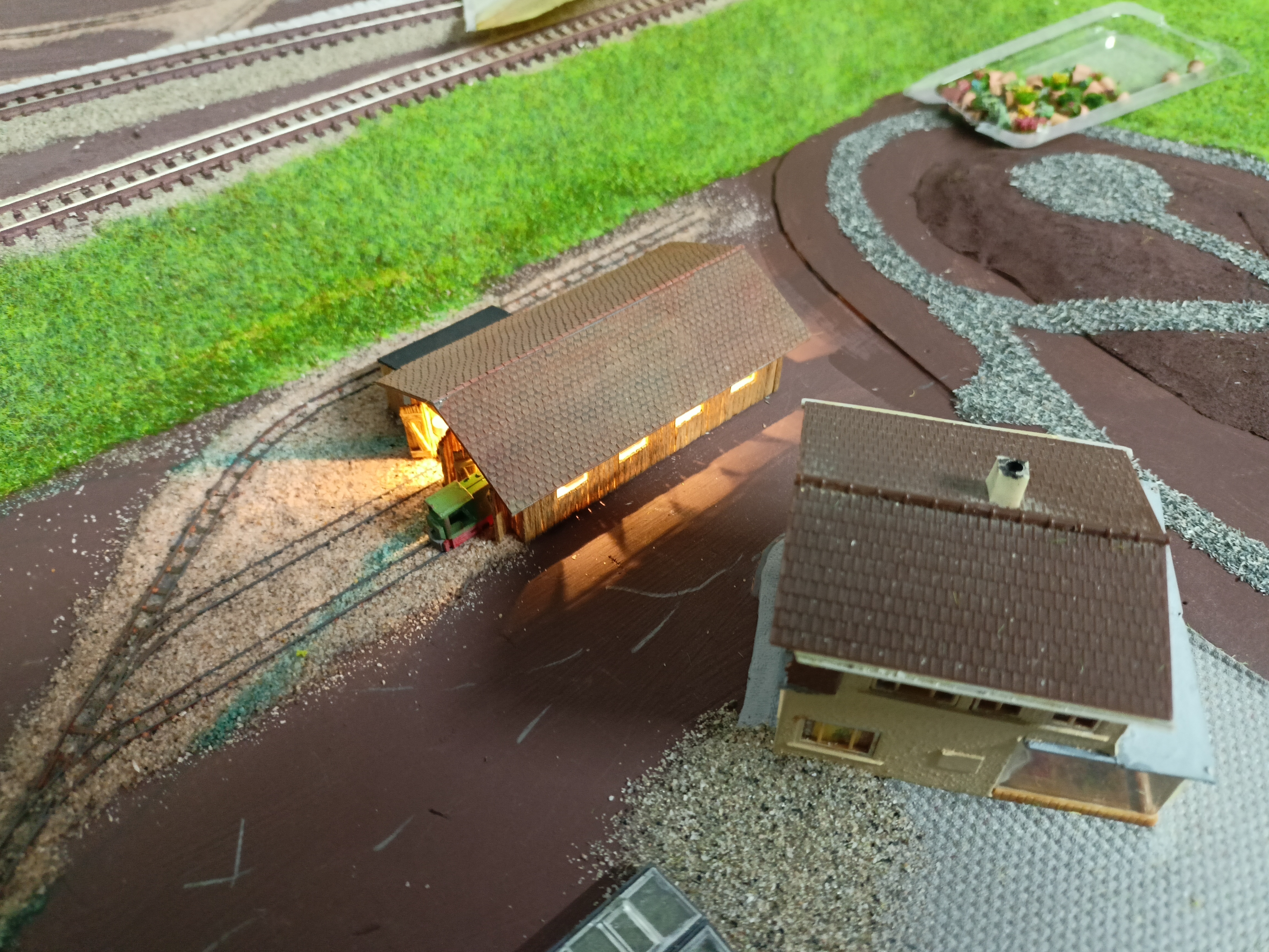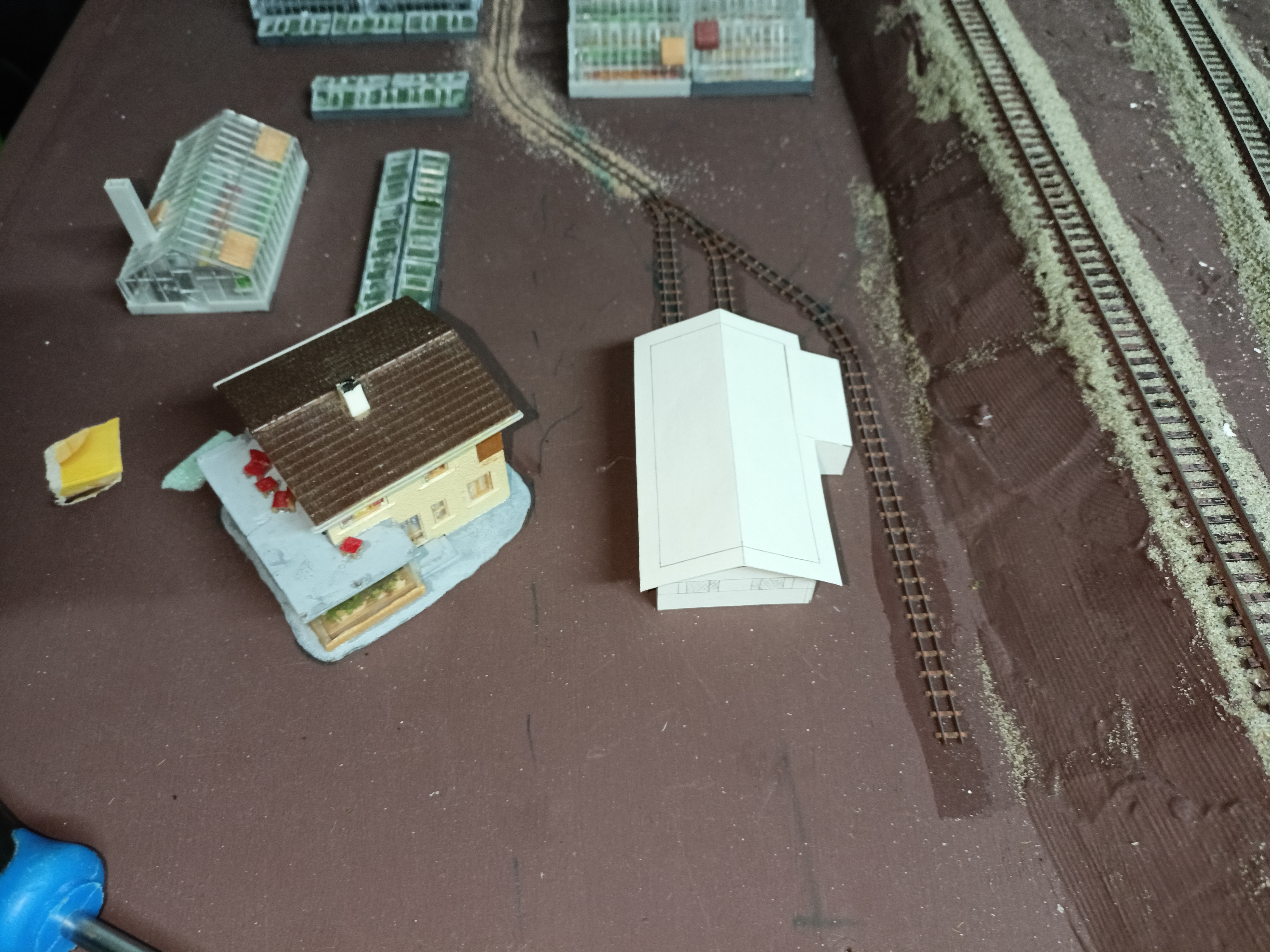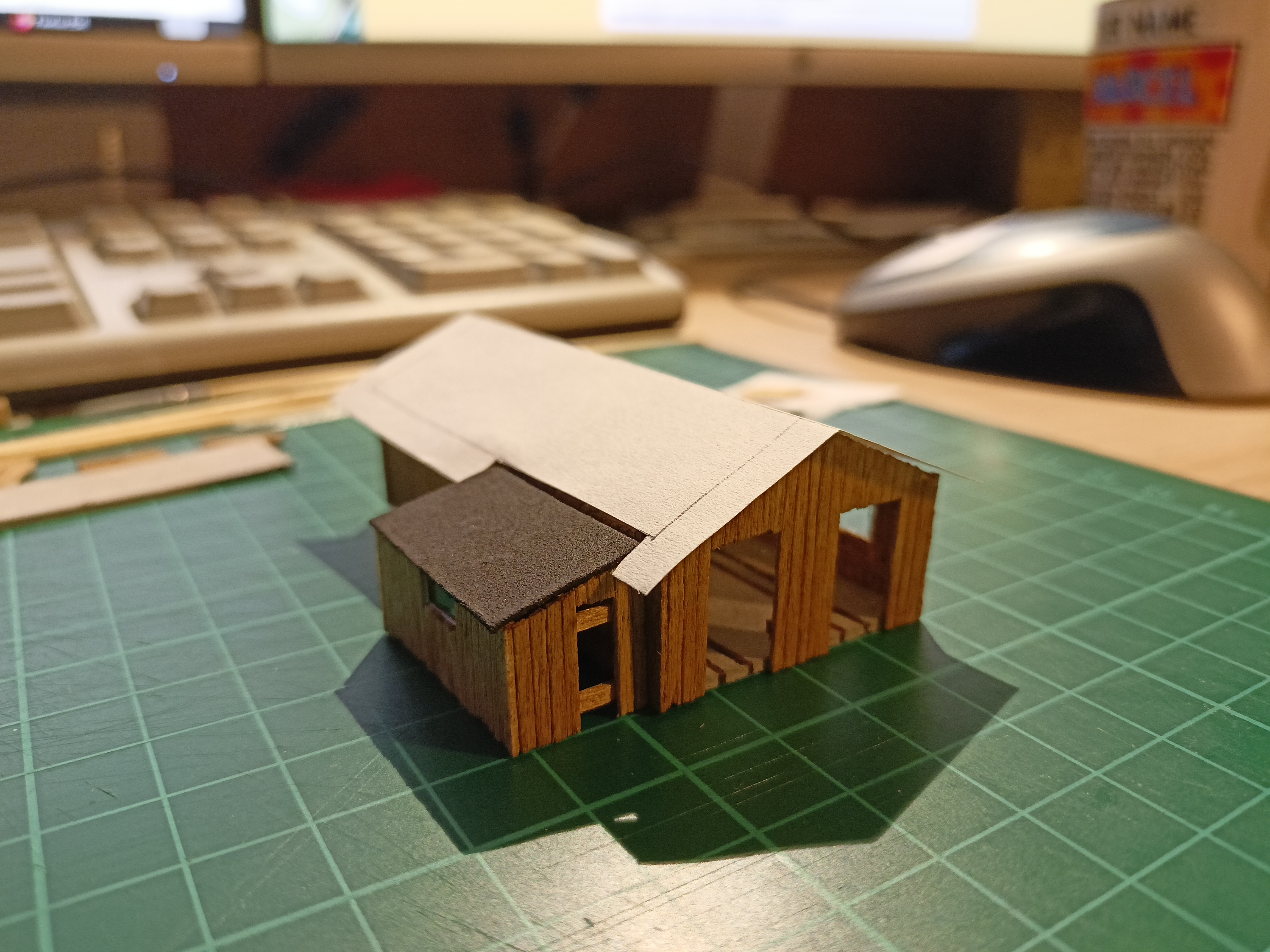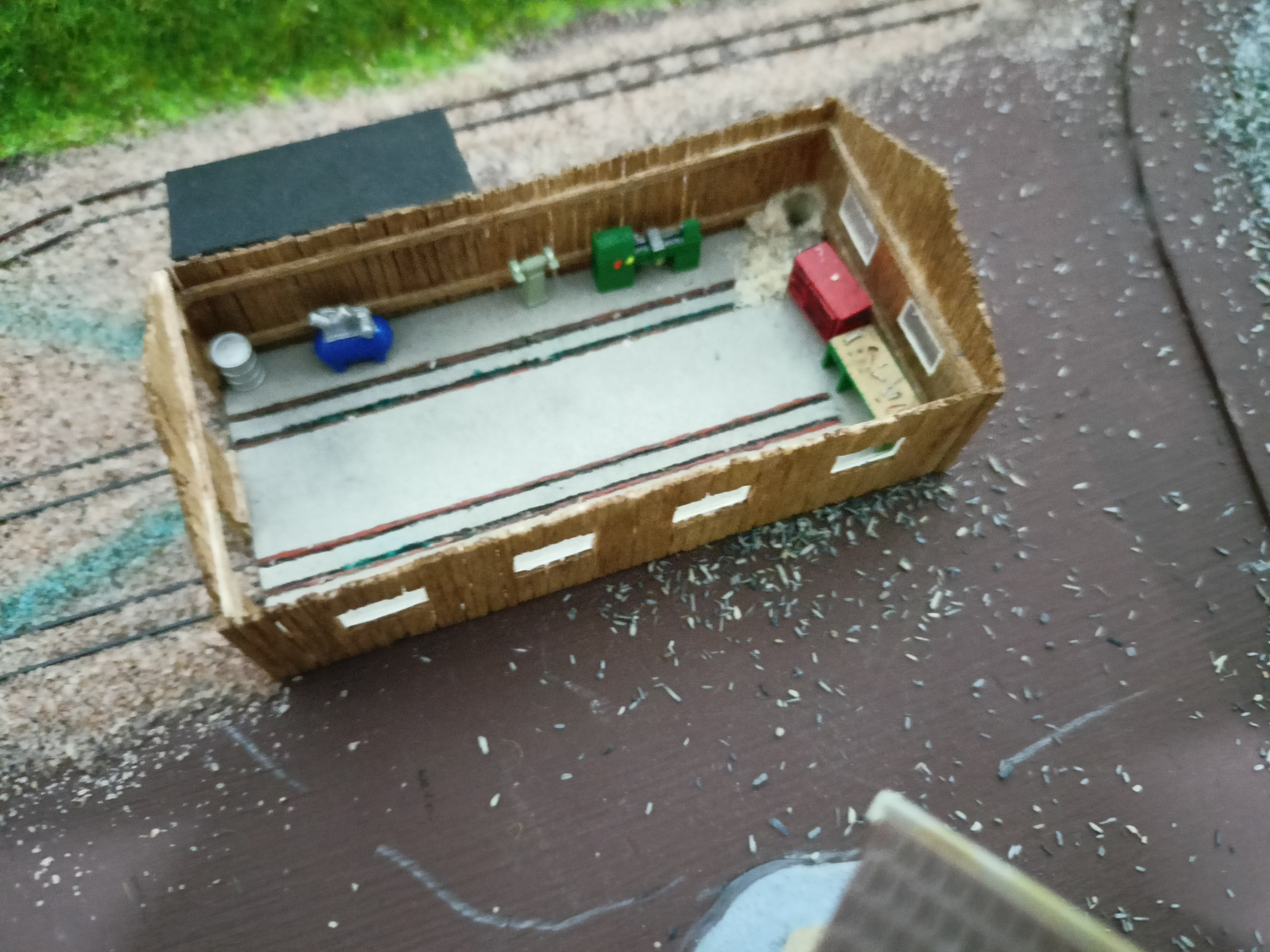 Wer hier aber kein Geld ausgeben möchte, kann auch den Hauptschuppen mit Dachpappe (also mit angemaltem Schleifpapier) decken. Alternativ kann ich mir noch Wellblech ganz gut vorstellen!