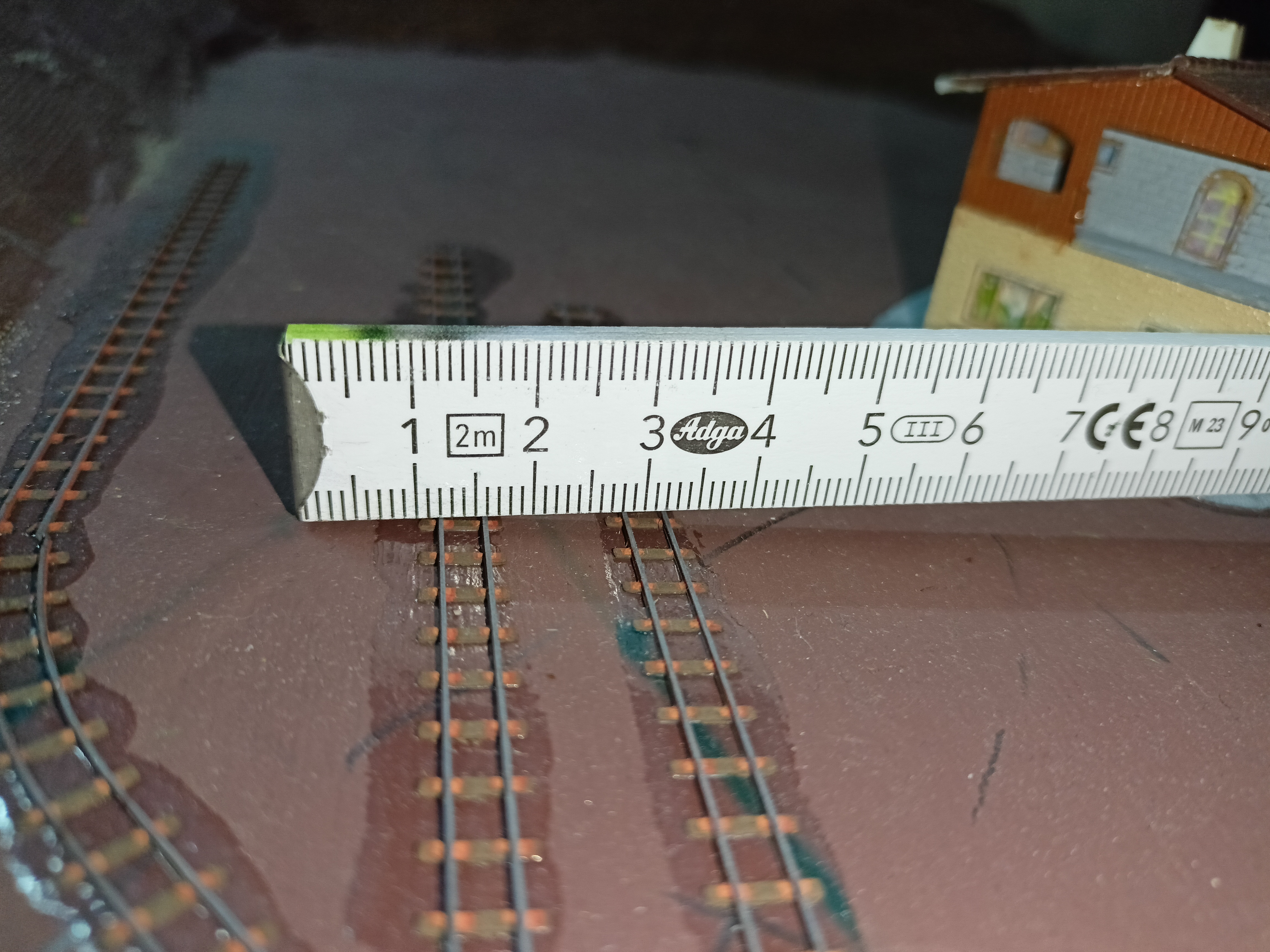 (Die Spurweite ist bekannt: 3,75mm, allerdings konnte beim Bau der Bodenplatte der Abstand zwischen den beiden Gleise nur geschätzt werden.