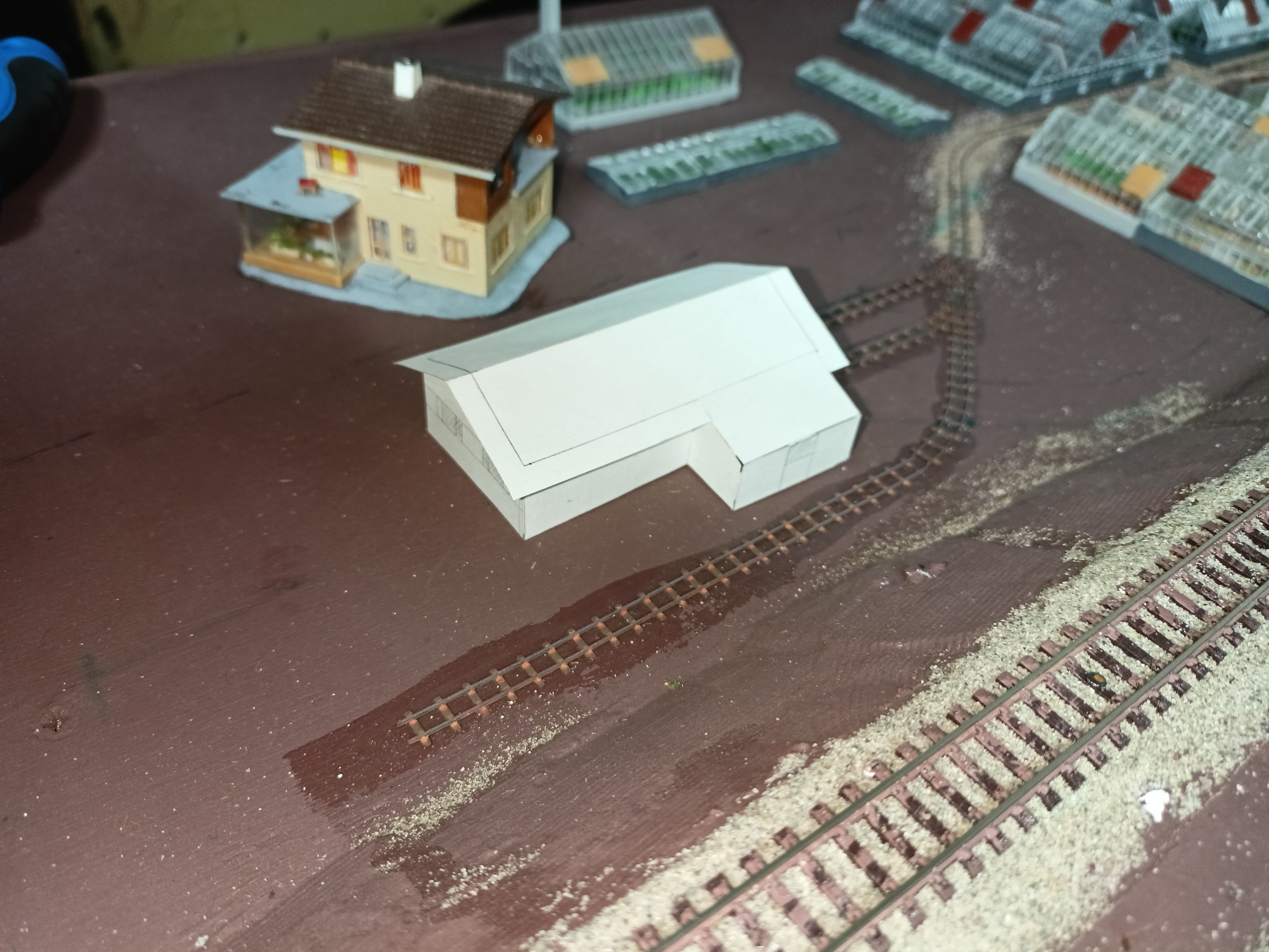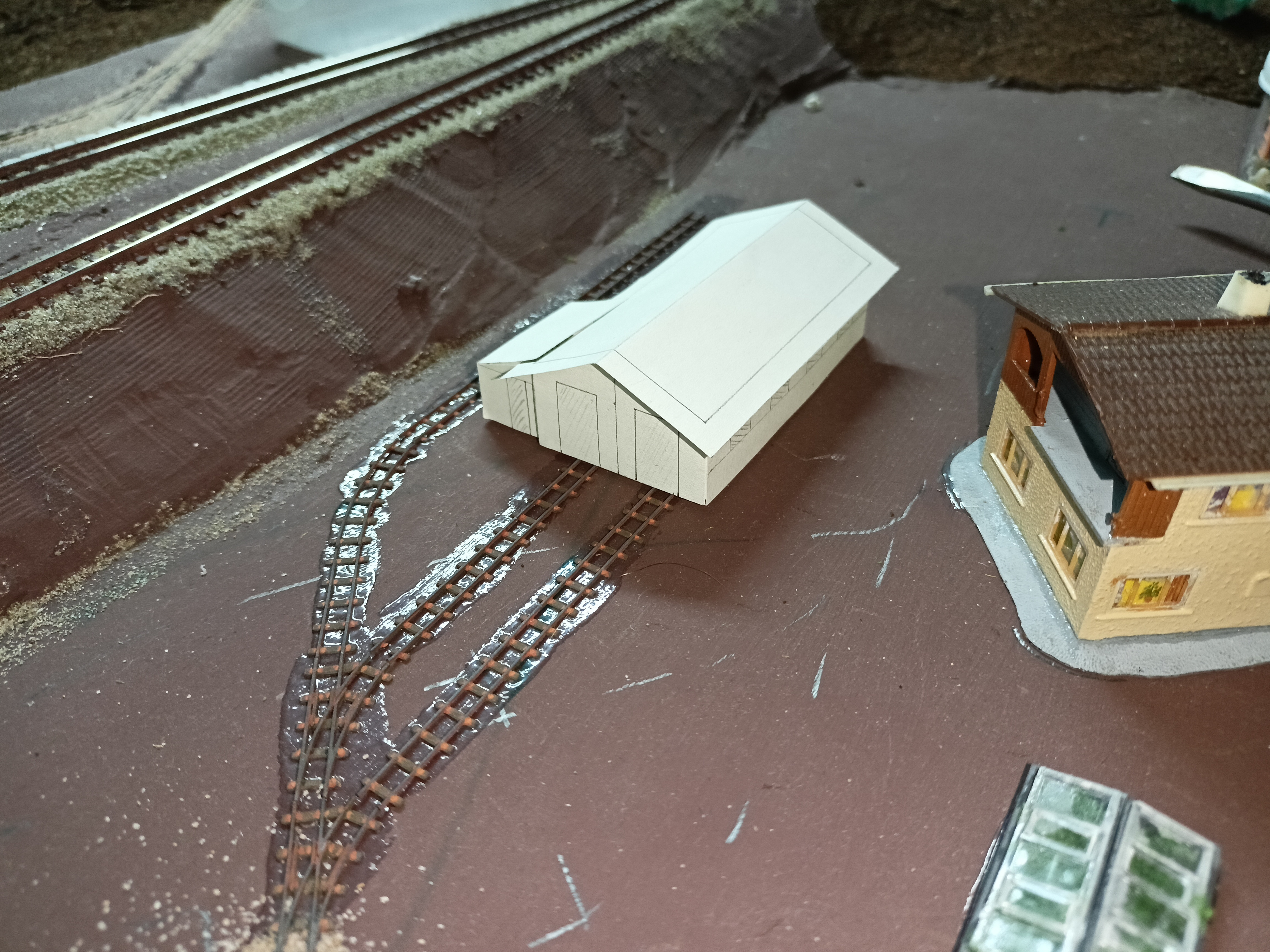 Die ursprüngliche Idee war es, den Boden in den Bereichen der schon verbauten Schienen auszuschneiden und dann die Schienen dort im Schuppen zu schottern.