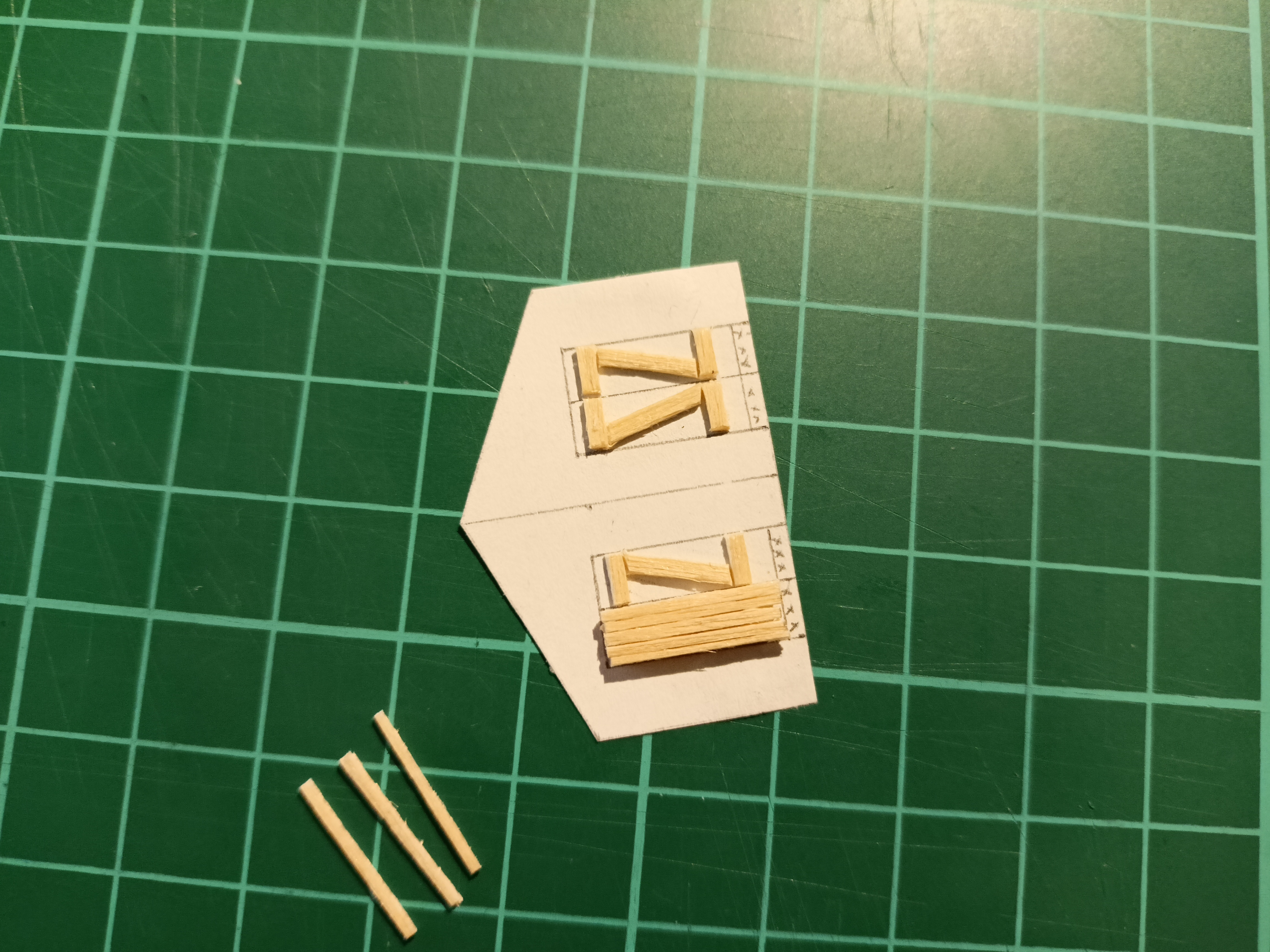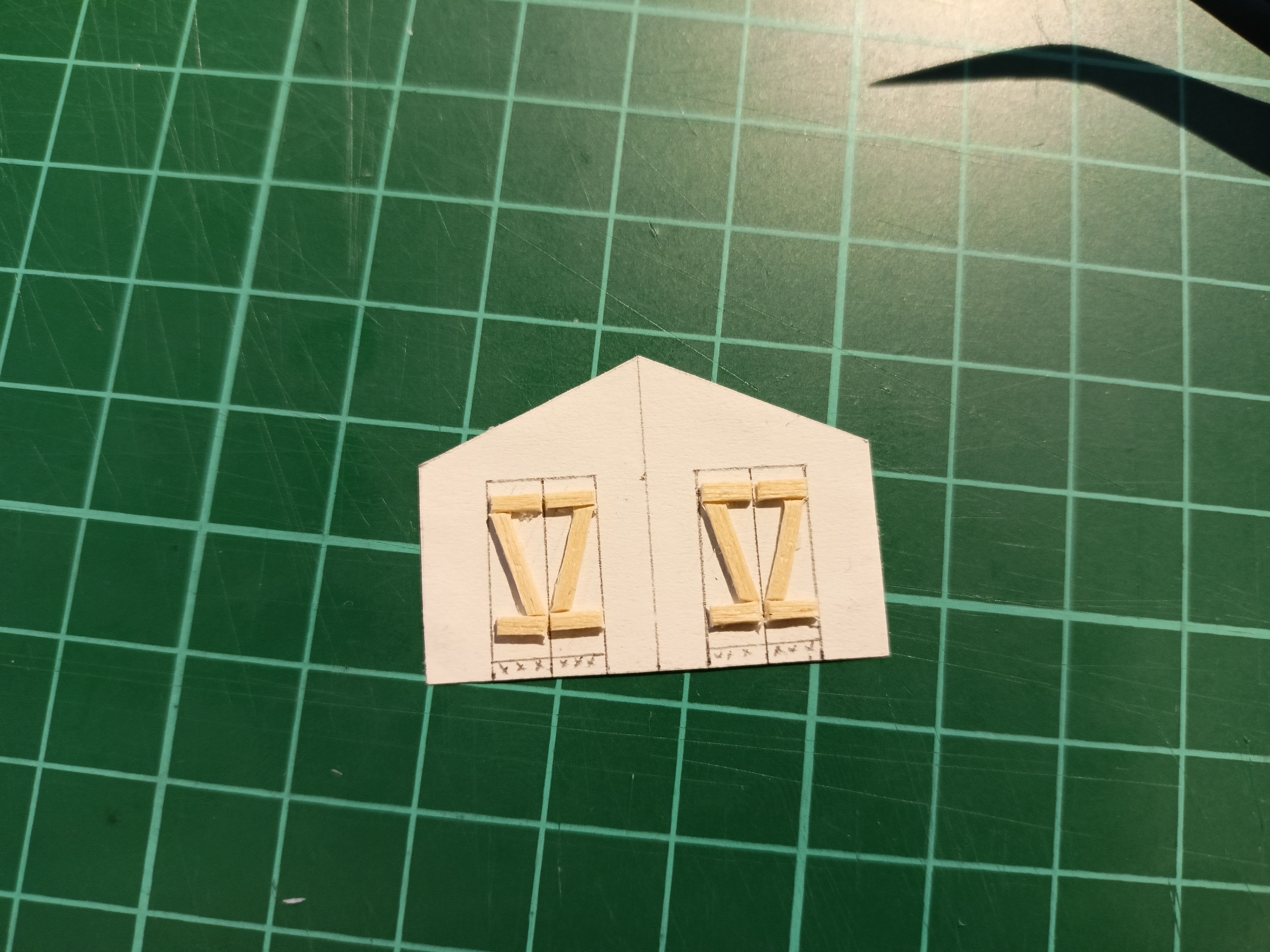 Beim Zusammenkleben der Wände entpuppte sich ein weiterer Vorteil der Papiervorlage: Die Querstreben konnten punktuell mit einem Uhu-Stick auf dem Papier angeheftet werden, wodurch man die Papierwand wunderbar auch als Vorlage für das Holz verwenden: